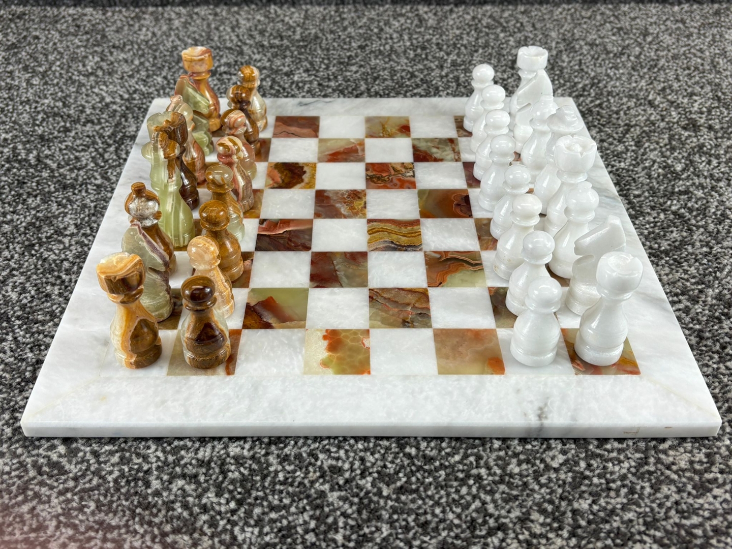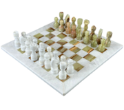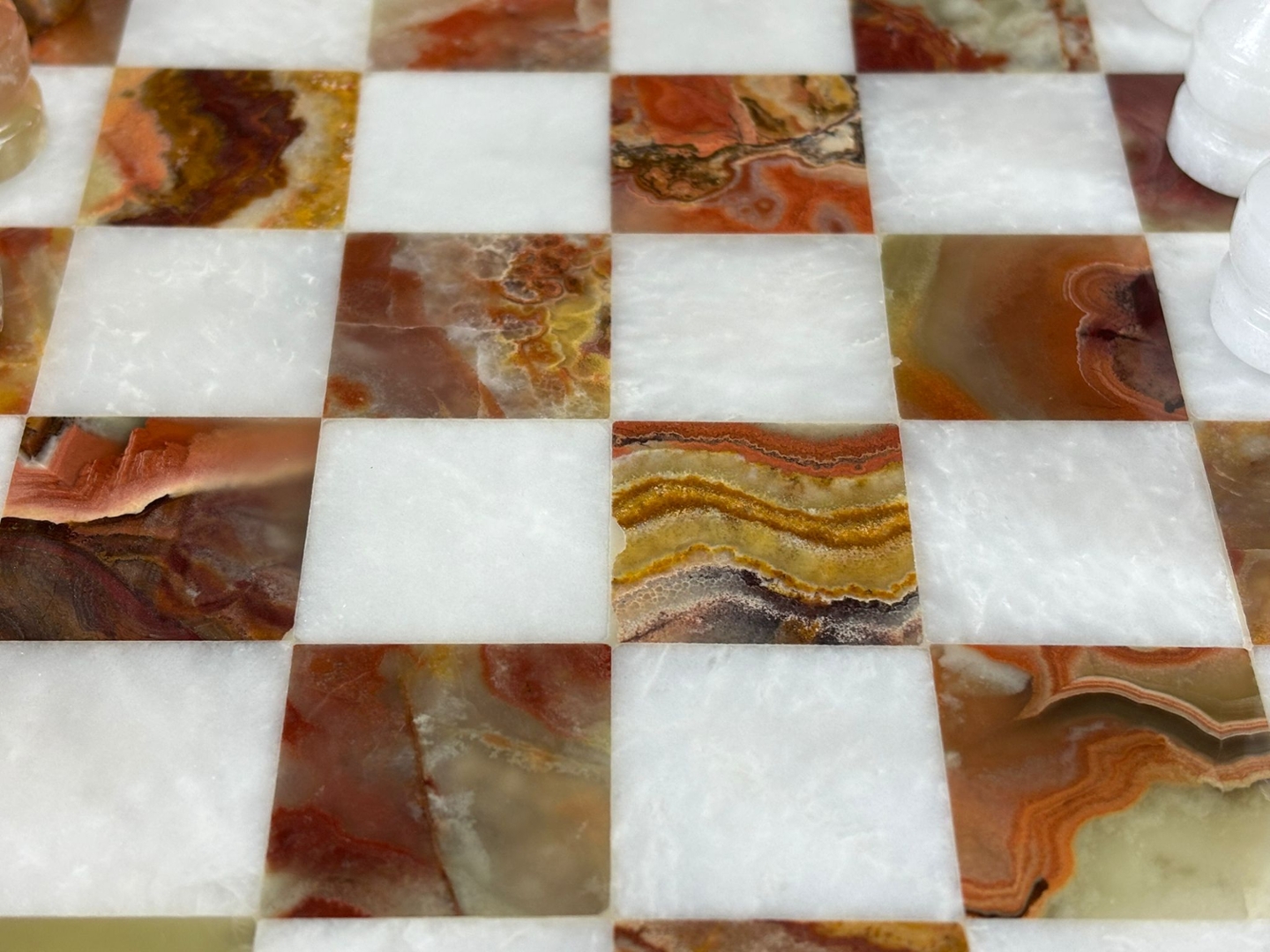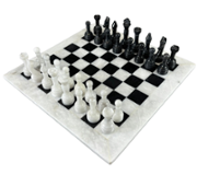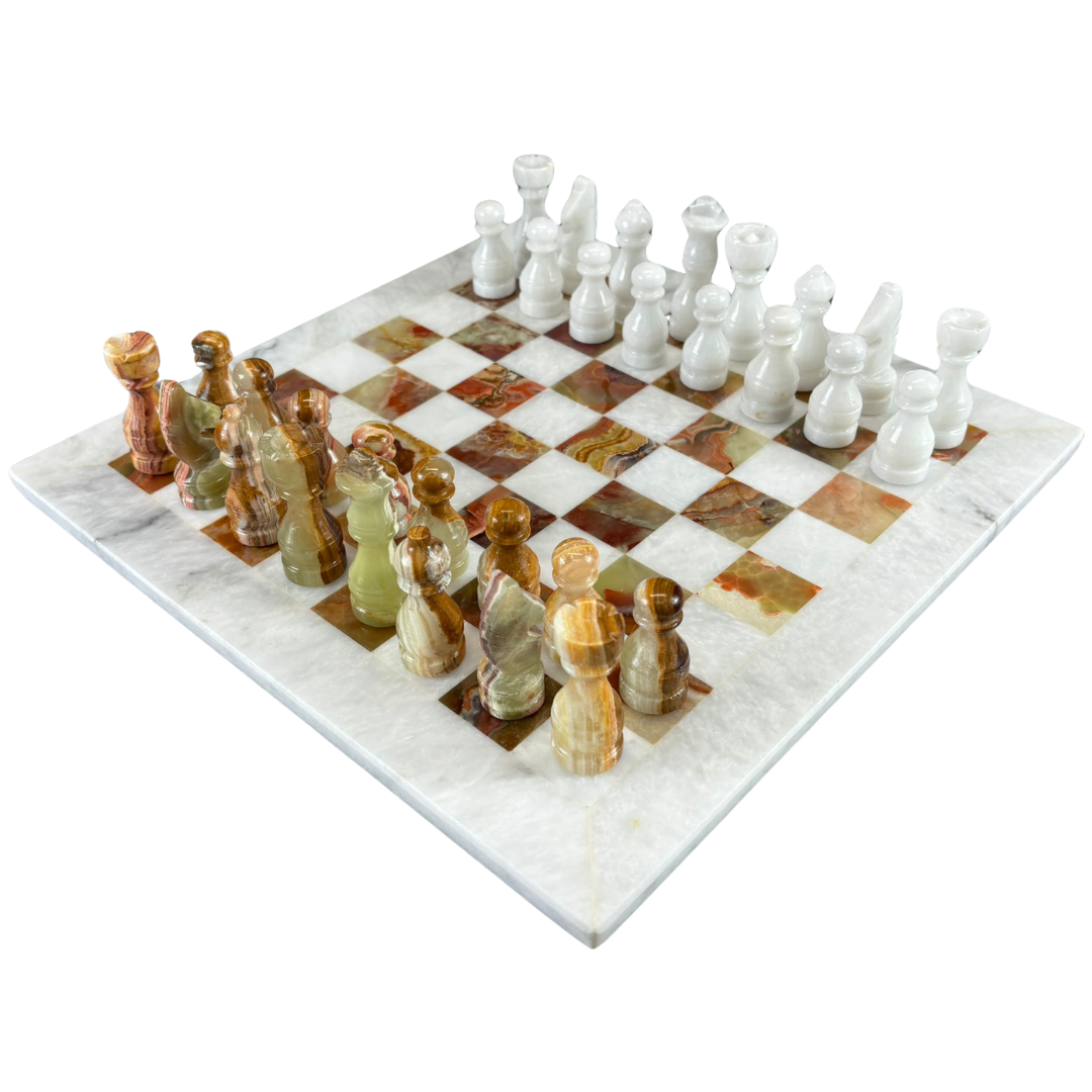 A brown and white hand carved marble chess set that showcases both artistry and functionality. Each piece has been carefully shaped from natural marble, featuring warm, earthy browns contrasted beautifully with smooth white stone. The natural veining and variation in the marble make every figure unique, while the solid weight of the pieces adds a touch of luxury to each move. Measuring approximately 12 inches by 12 inches, the set offers the perfect balance between playability and compact display.