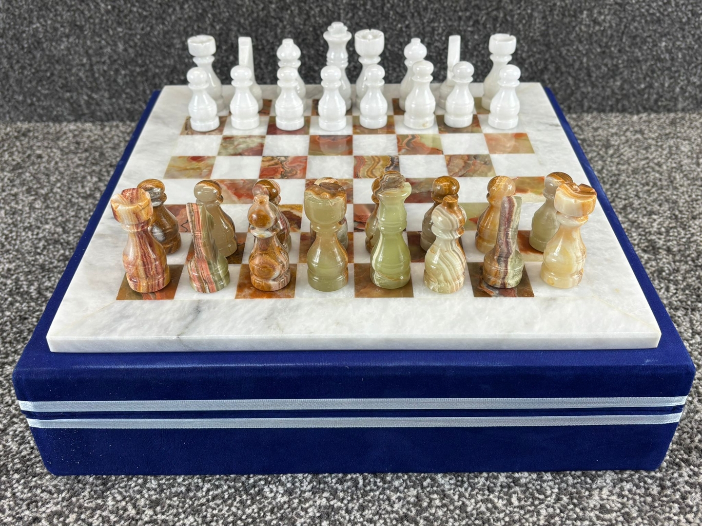 A brown and white hand carved marble chess set with a velvet storage case. Approximately 12" length, 12" width.