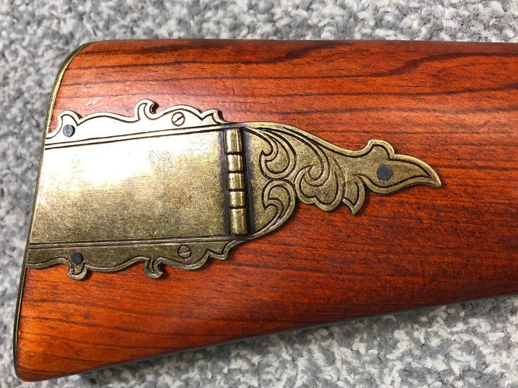 Measuring approximately 44 inches in length, this replica faithfully replicates the distinctive features of 19th-century Kentucky Rifles. From its gracefully curved stock to the intricate brass hardware and engraved details, every aspect of this rifle reflects the craftsmanship and ingenuity of the era.
