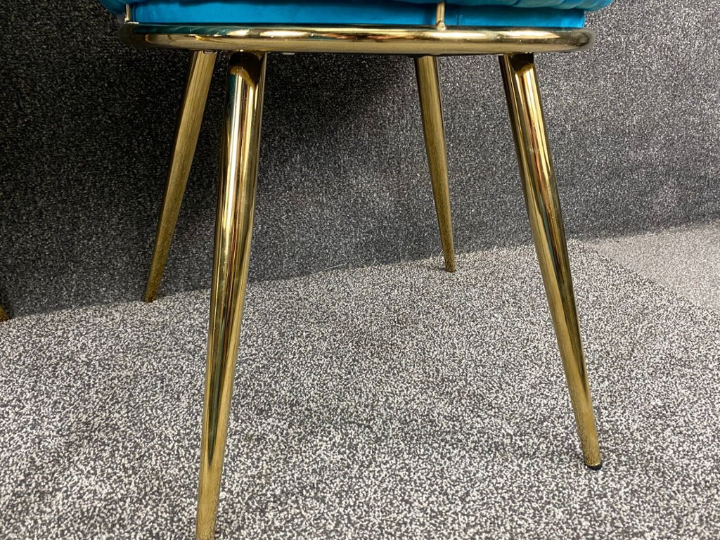 Each chair is supported by slender gold legs, which not only provide stability but also enhance the chair's opulent aesthetic with their gleaming finish. The combination of the vibrant blue velvet and the lustrous gold legs exudes a sense of glamour and refinement, making these chairs a stunning addition to any interior.