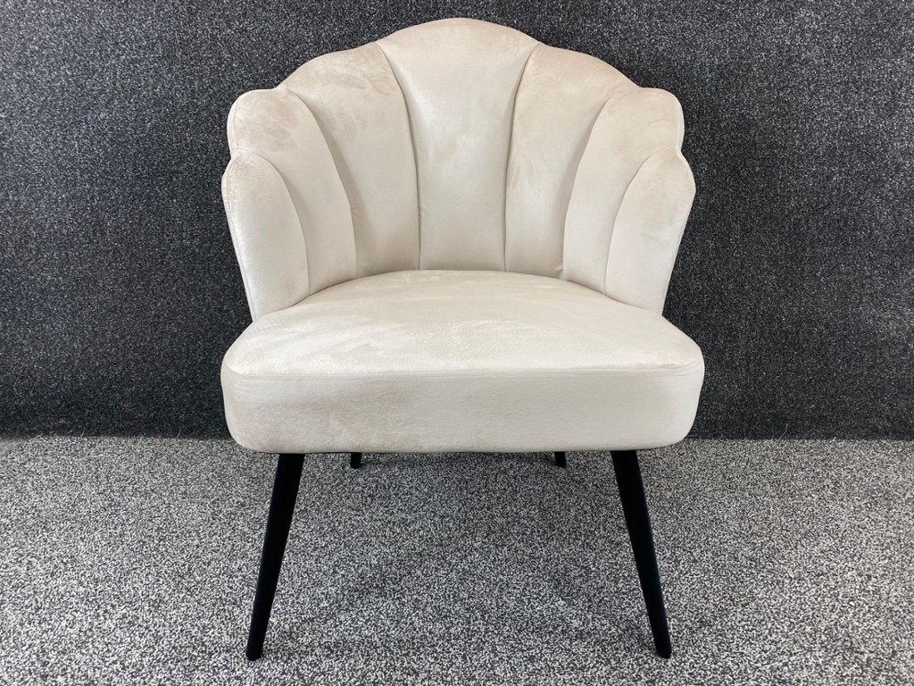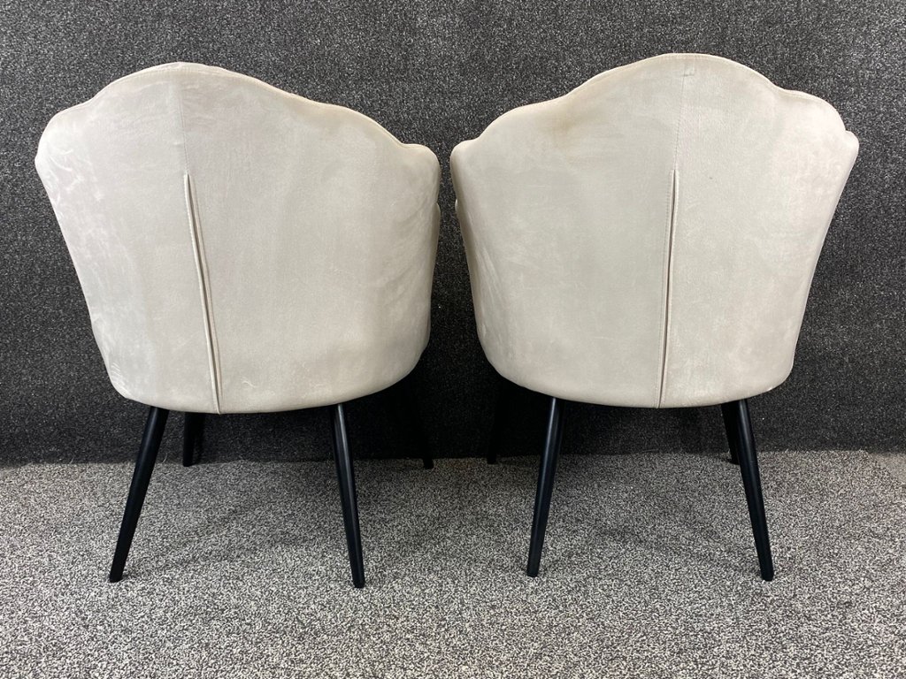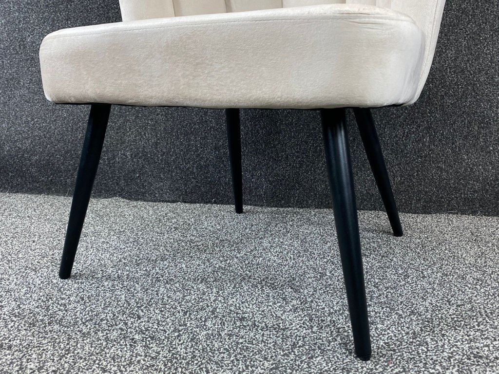 Each chair is gracefully supported by sleek black legs, creating a striking contrast with the creamy velvet and adding a contemporary edge to the classic design. The sturdy black legs ensure both stability and durability, making these chairs a reliable and stylish choice for any room.