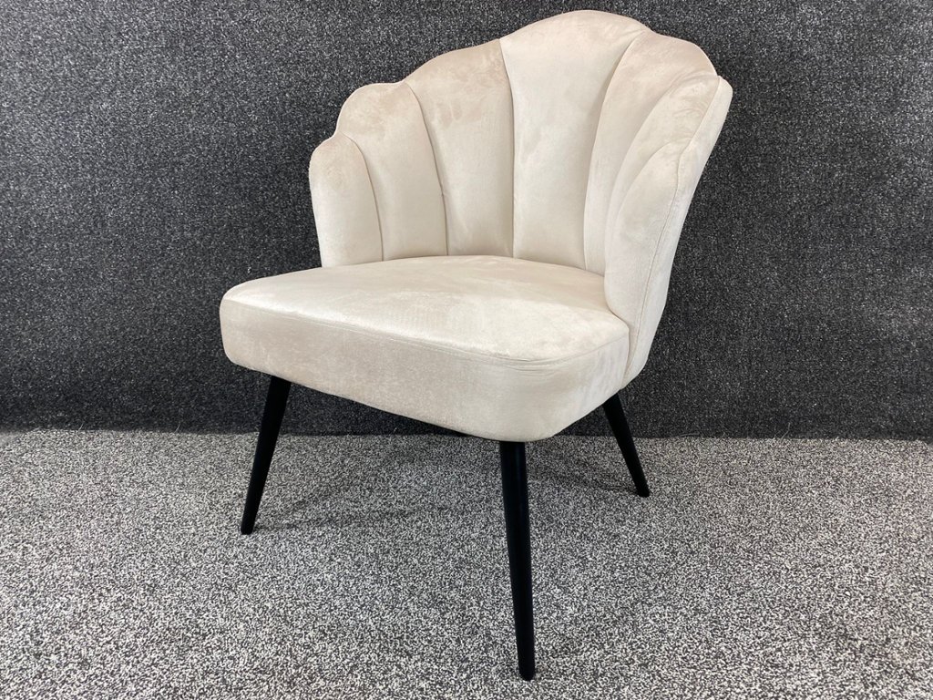A Pair of Cream French Velvet Shell Design Kitty Chairs on Black Legs. Approx 32" height, 29" width, 23" depth.