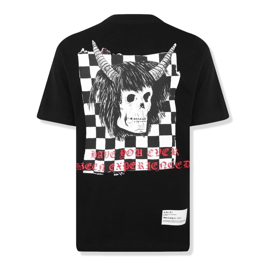 An Amiri Wes Lang Checker Skull Tee in Black. This brand-new t-shirt merges bold design with luxury, making it an essential piece for any modern wardrobe. Featuring the iconic Wes Lang checkerboard pattern and a striking skull graphic, this tee exudes a rebellious yet refined aesthetic. The black base enhances the vivid details, creating a bold contrast that demands attention.