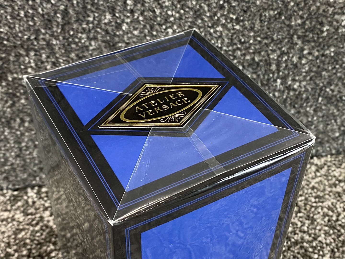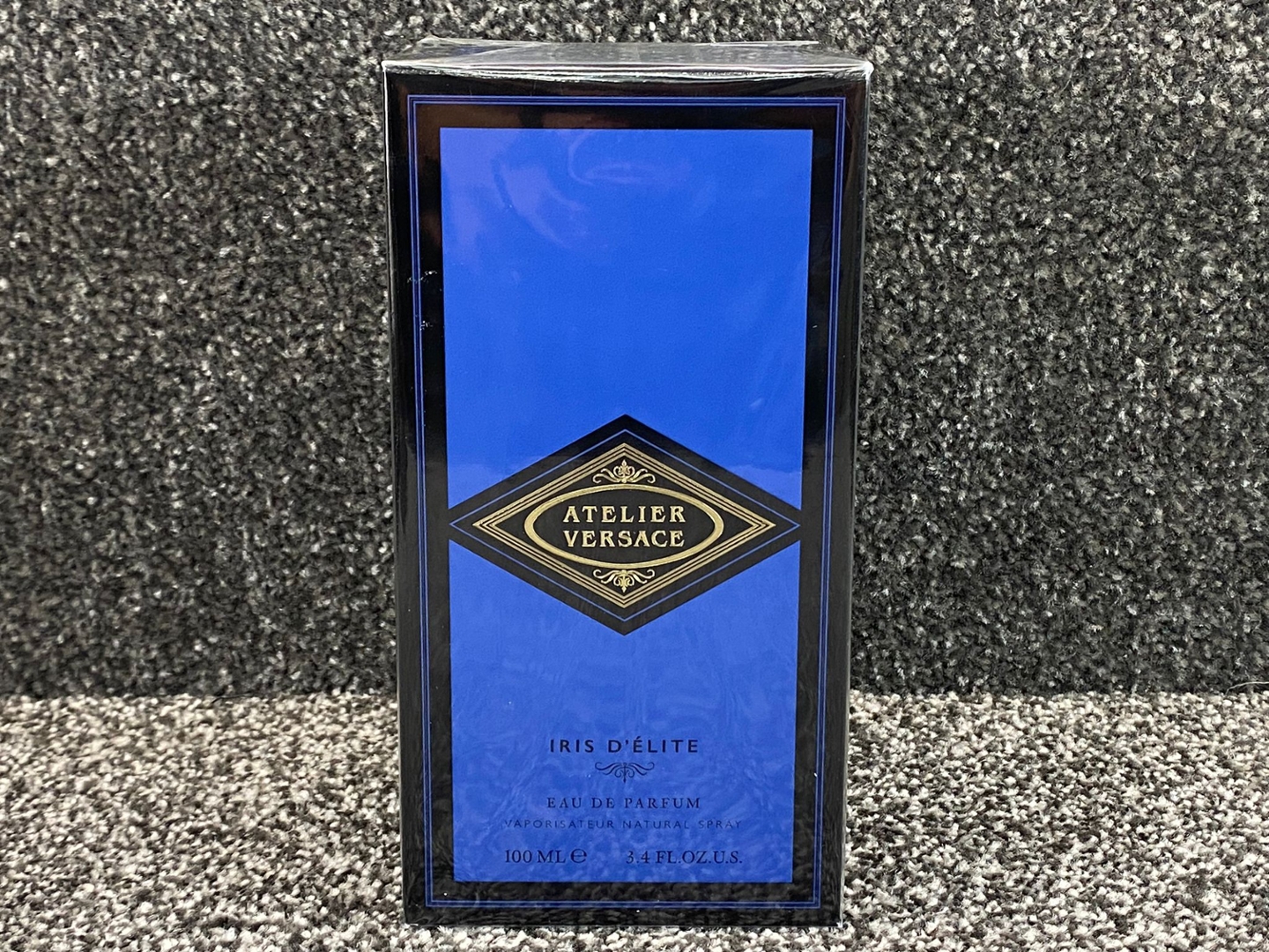 A bottle of Atelier Versace - Iris D'Elite Eau De Parfum in a presentation box.