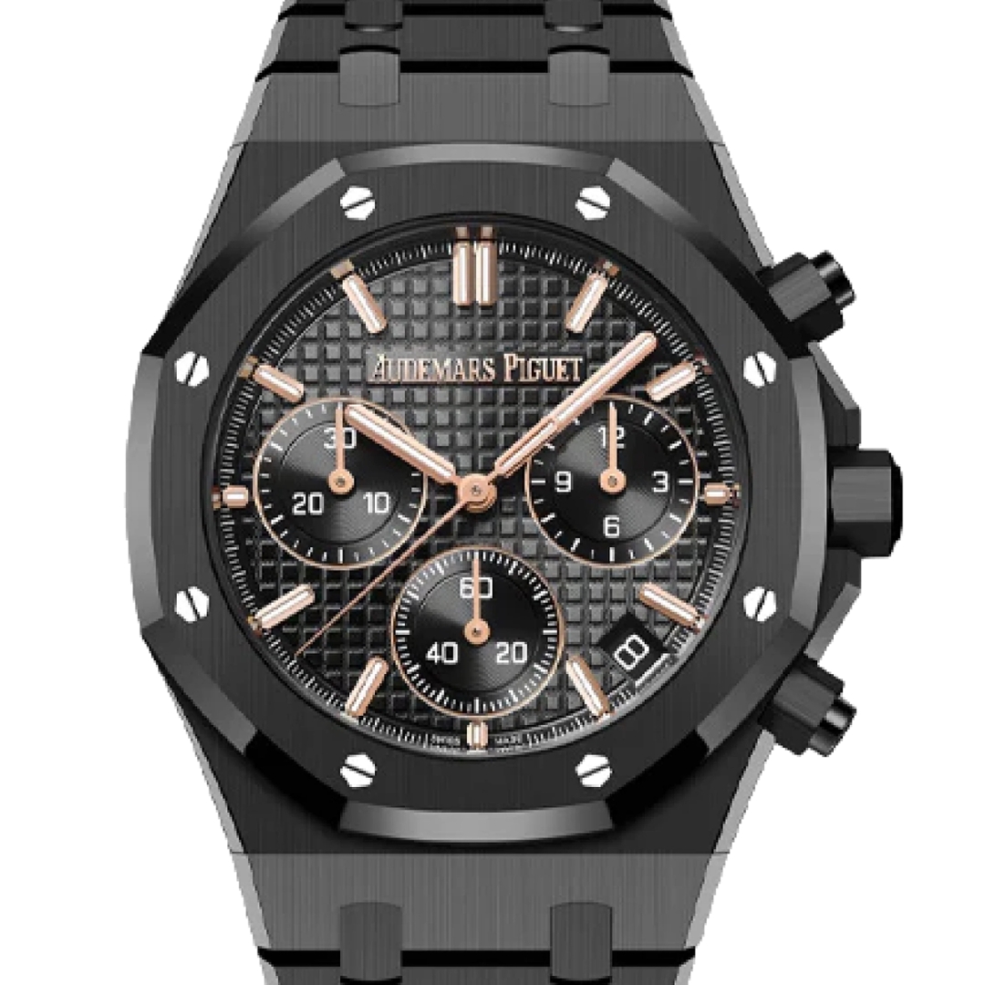 An Audemars Piguet Royal Oak Selfwinding Chronograph reference 26240CE in full black ceramic, presented boxed and certified with original Audemars Piguet paperwork. The 41mm case and integrated bracelet showcase the unmistakable Royal Oak architecture, executed entirely in high-performance ceramic for exceptional durability and modern presence. The black “Grande Tapisserie” dial is complemented by contrasting chronograph sub-dials and applied rose gold hour markers, delivering depth and refinement within a bold monochromatic aesthetic.
