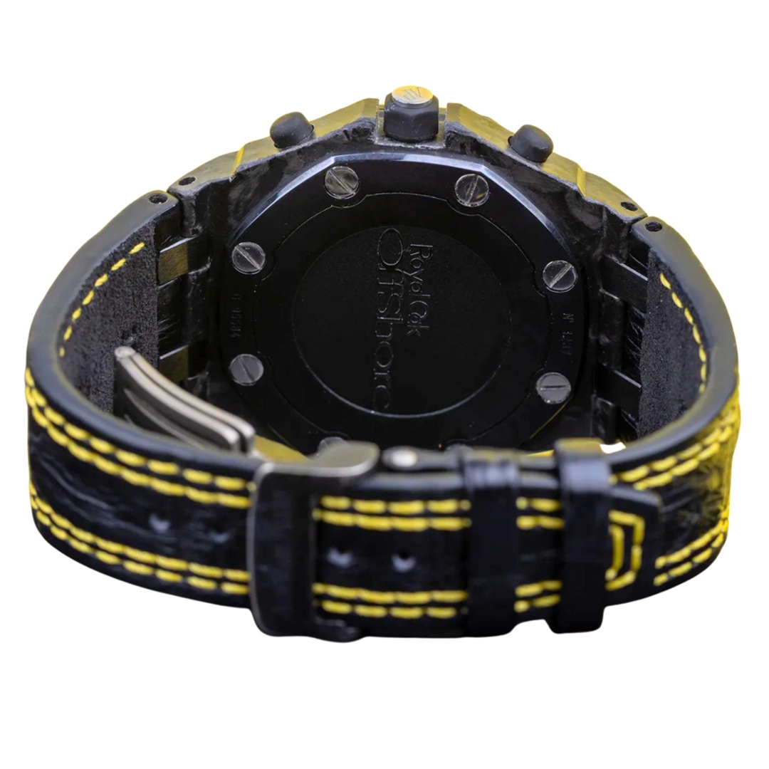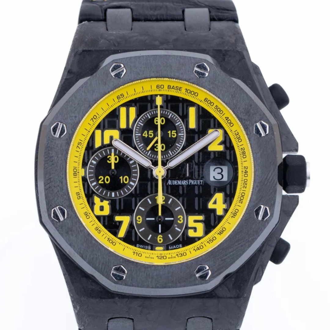 A bold and technically advanced Audemars Piguet Royal Oak Offshore Chronograph, crafted in forged carbon and presented with a striking black dial accented by vivid yellow detailing. The 42mm case showcases the distinctive marbled carbon texture, offering both visual depth and lightweight durability, while the iconic octagonal bezel and exposed screws reinforce its unmistakable Offshore identity. The high-contrast dial, oversized Arabic numerals, and chronograph layout deliver exceptional legibility and a strong, contemporary presence.