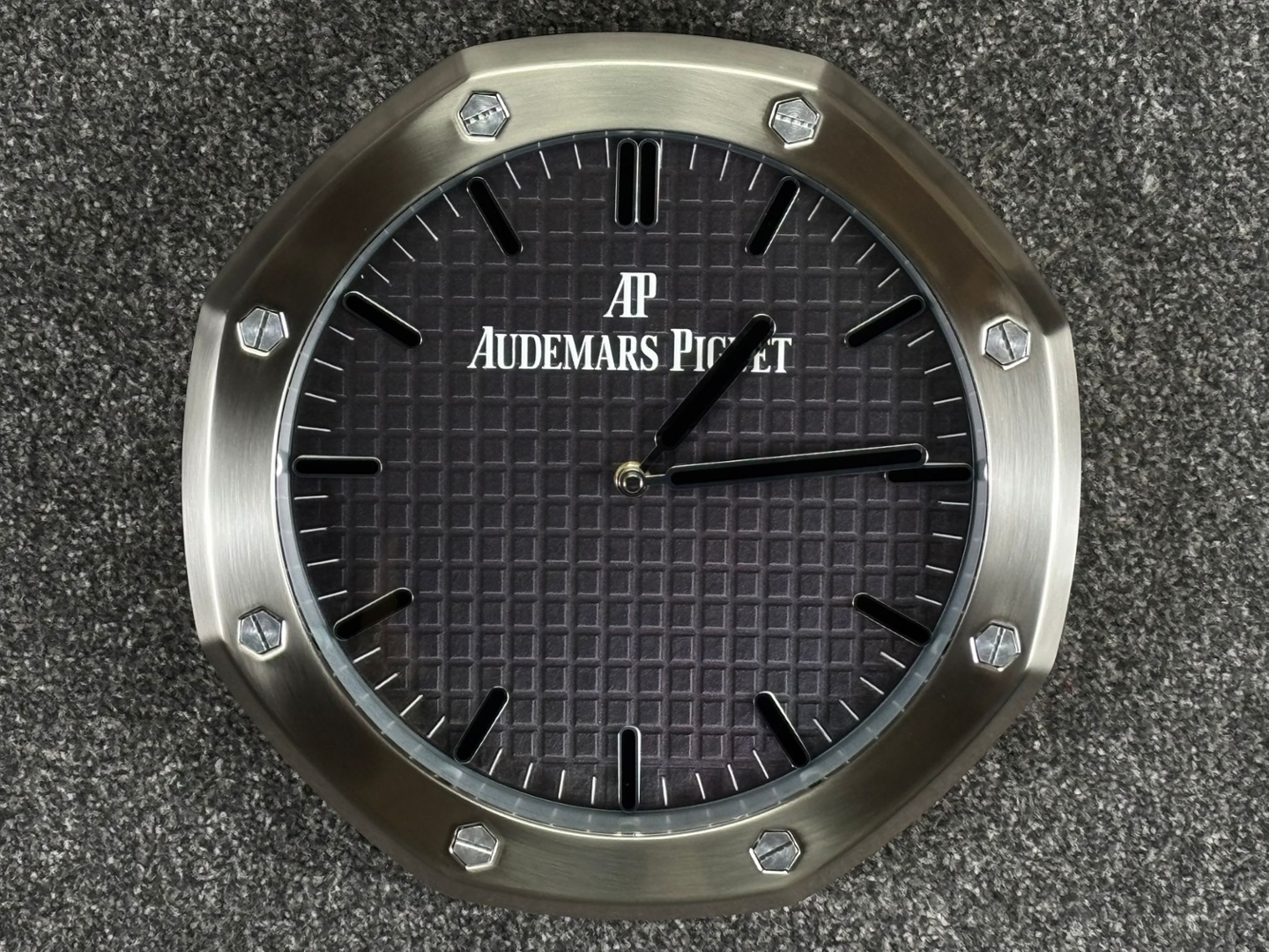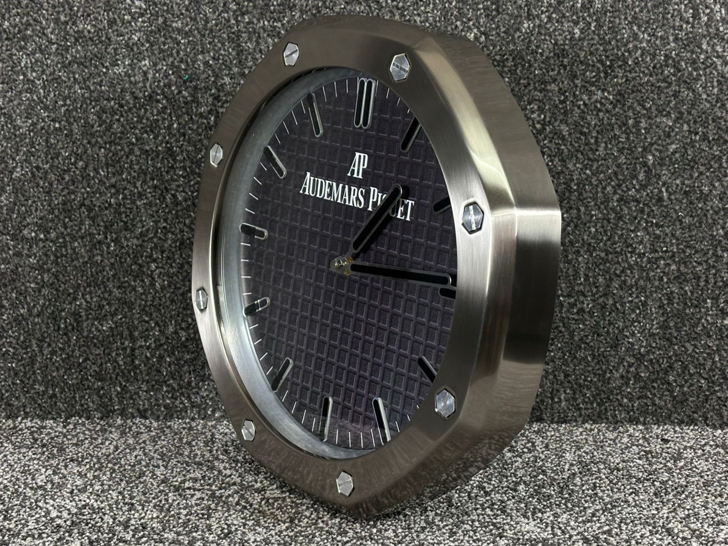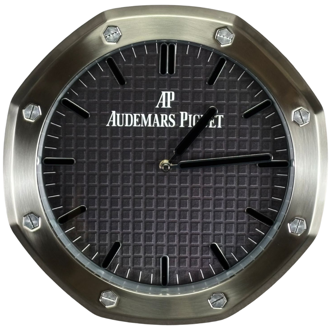 A stainless steel replica Audemars Piguet wall clock, inspired by the instantly recognisable Royal Oak design. Showcasing a bold silver-toned octagonal bezel with exposed screw detailing, this piece captures the architectural aesthetic that defines the brand. The black textured “tapisserie-style” dial is complemented by luminous-style hour markers and baton hands, delivering a clean yet highly distinctive look.