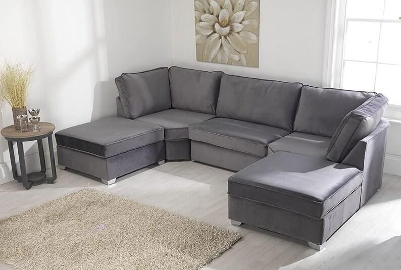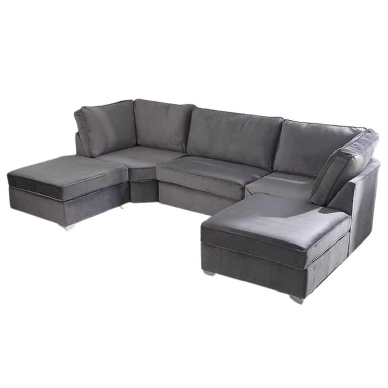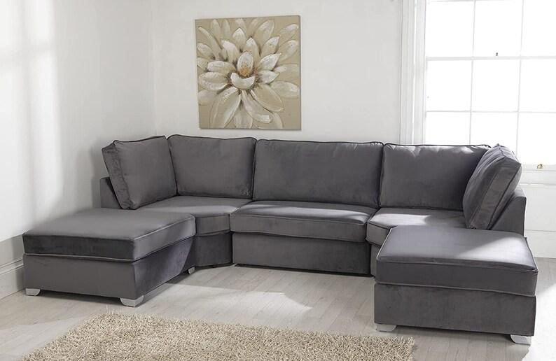 Belgravia Plush Grey U Shaped Fullback Sofa, a stylish and comfortable centerpiece for any modern living space. This luxurious sofa features a spacious U-shaped design, providing ample seating for family and guests. Upholstered in sumptuous grey plush fabric and supported by sleek silver metal legs, it exudes contemporary elegance.