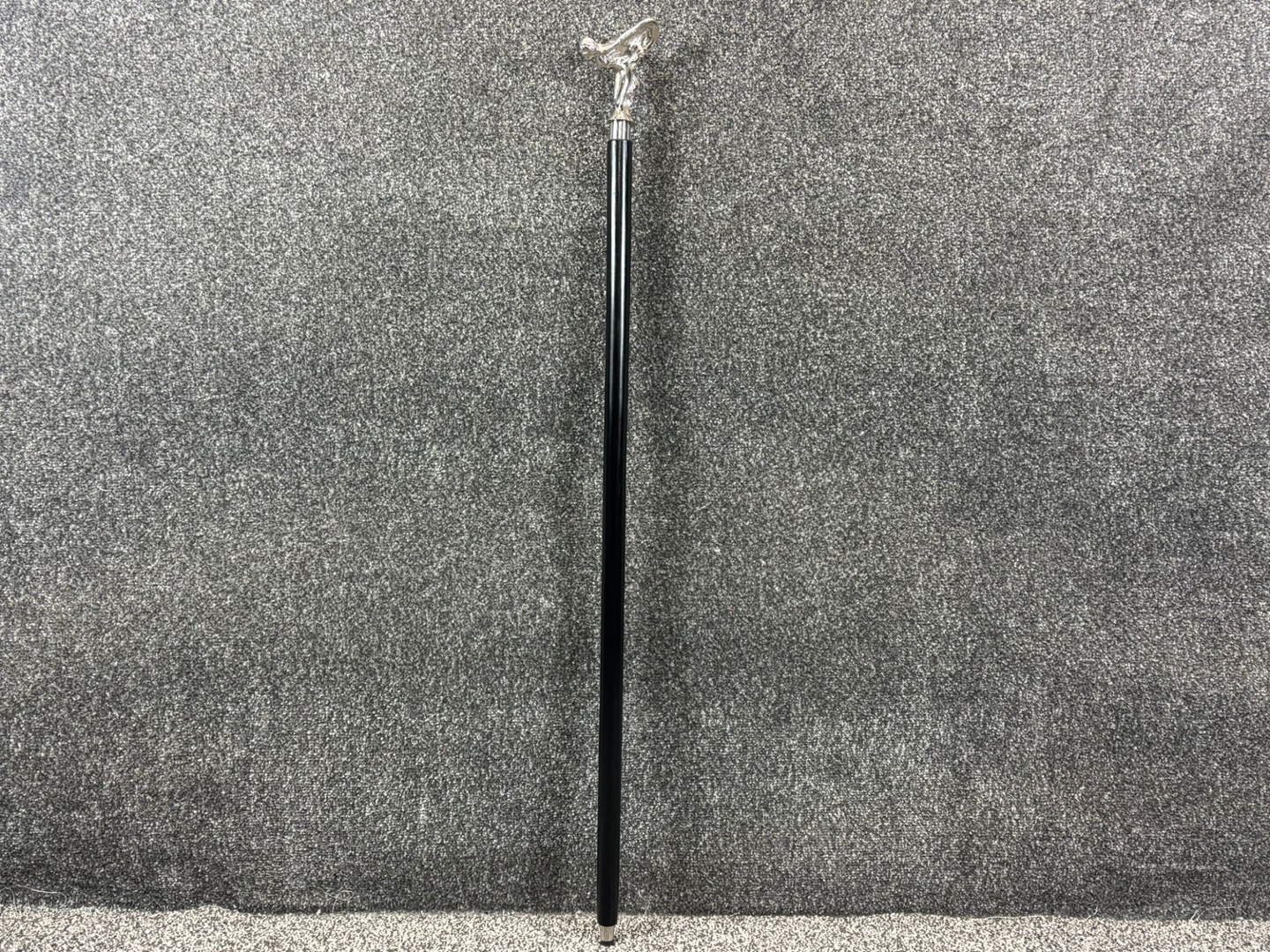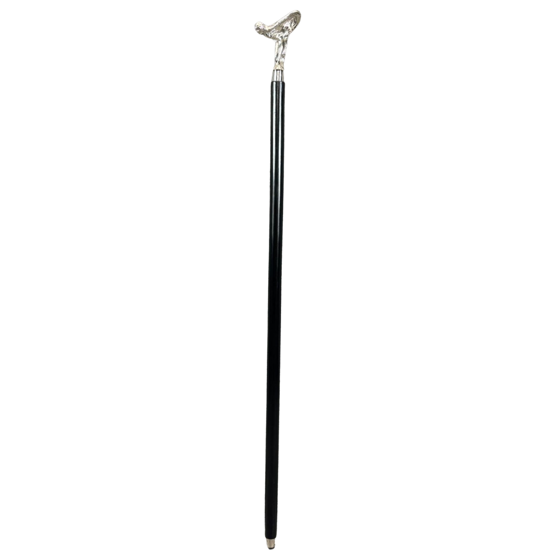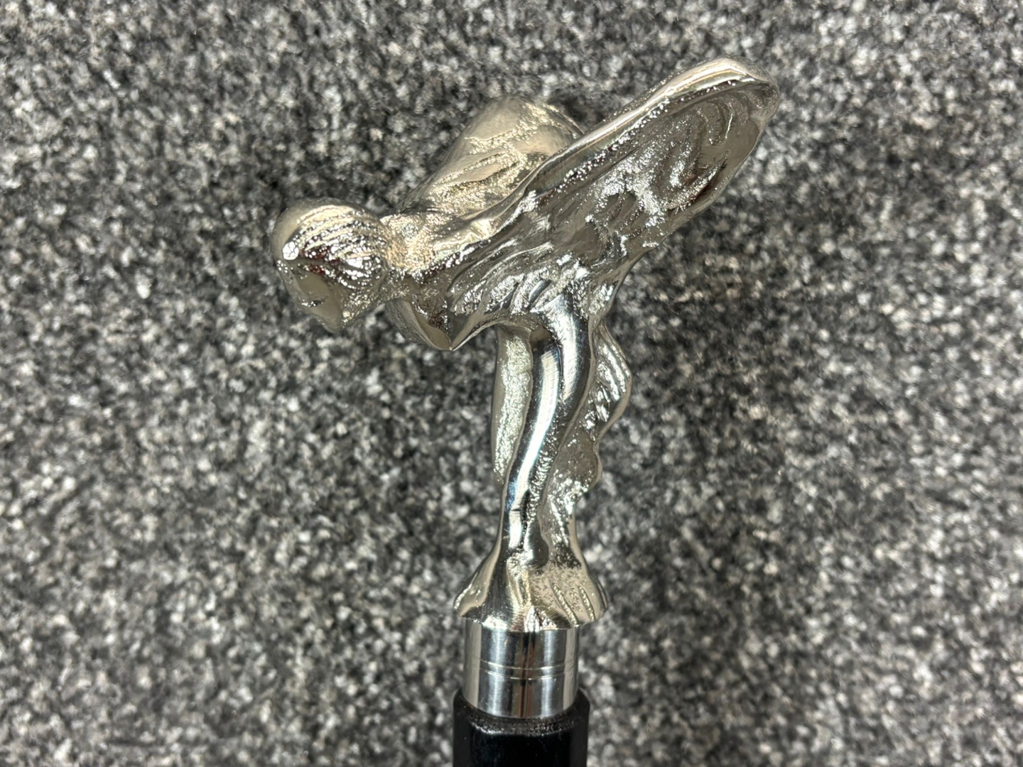 A black and chrome Rolls-Royce emblem-style cane—an accessory that speaks volumes of refinement and stature. Standing at approximately 32 inches in height, this graceful cane features a sleek, jet-black shaft paired with a silver-toned handle modelled after the iconic “Spirit of Ecstasy” figure, the unmistakable symbol of the Rolls-Royce legacy.