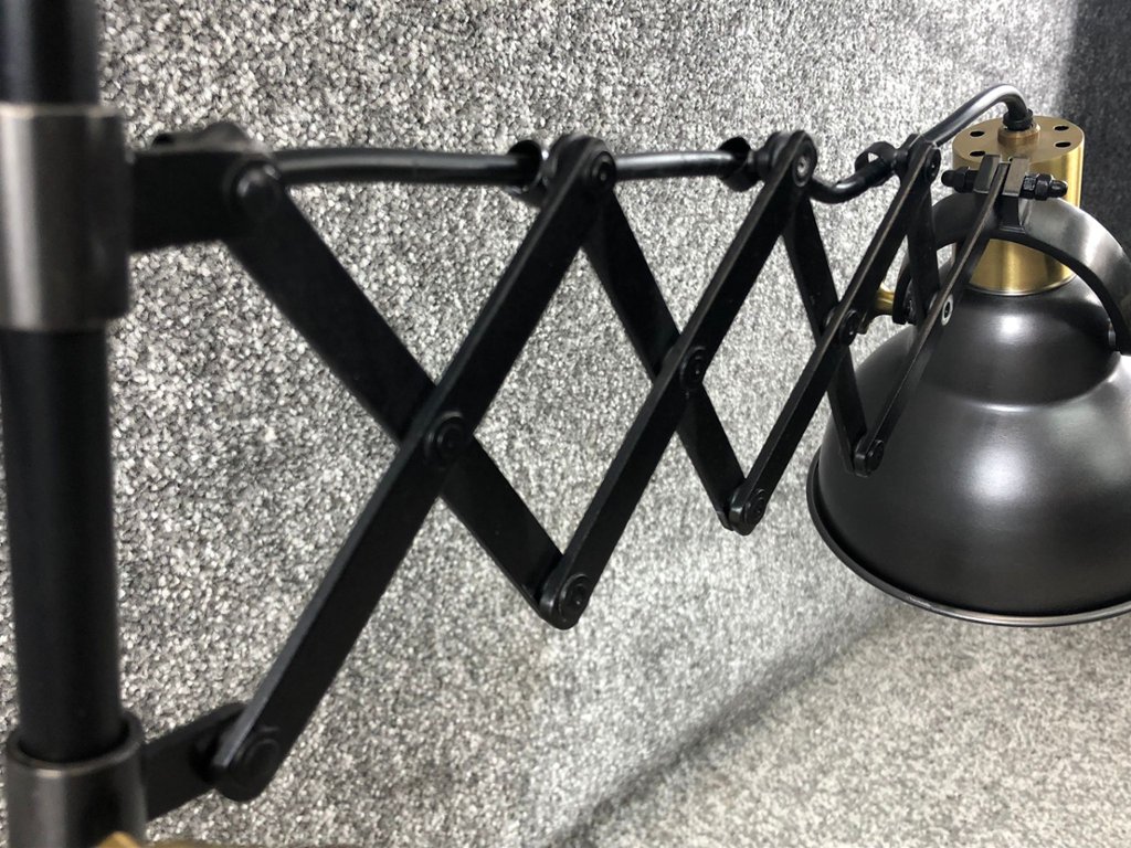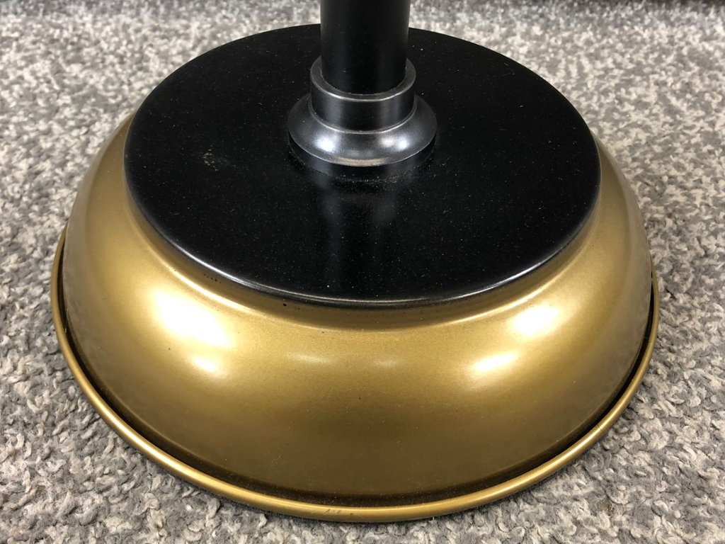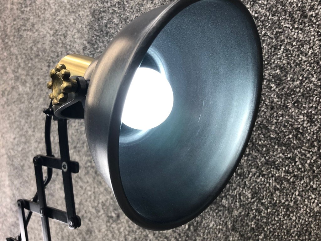 A black and gold adjustable table top lamp. Approx 21" height, 14" width.