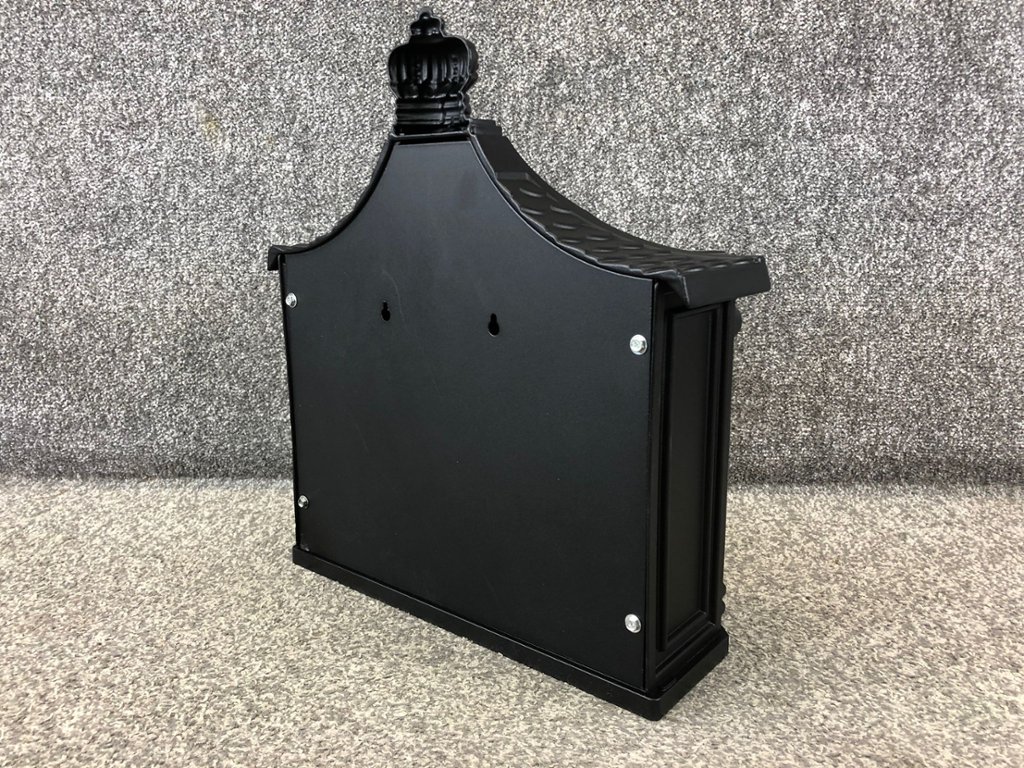 A black & gold aluminium wall mountable Jockey design post box with keys. Approx 18" height, 17" length, 6" width.
