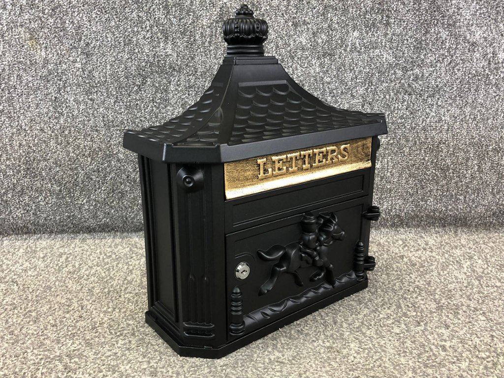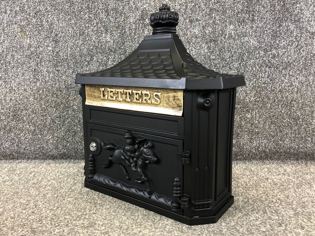 A black and gold aluminium wall-mountable Jockey design post box, complete with keys for added security and convenience. This striking post box stands approximately 18 inches in height, 17 inches in length, and 6 inches in width, making it a standout feature on any wall.