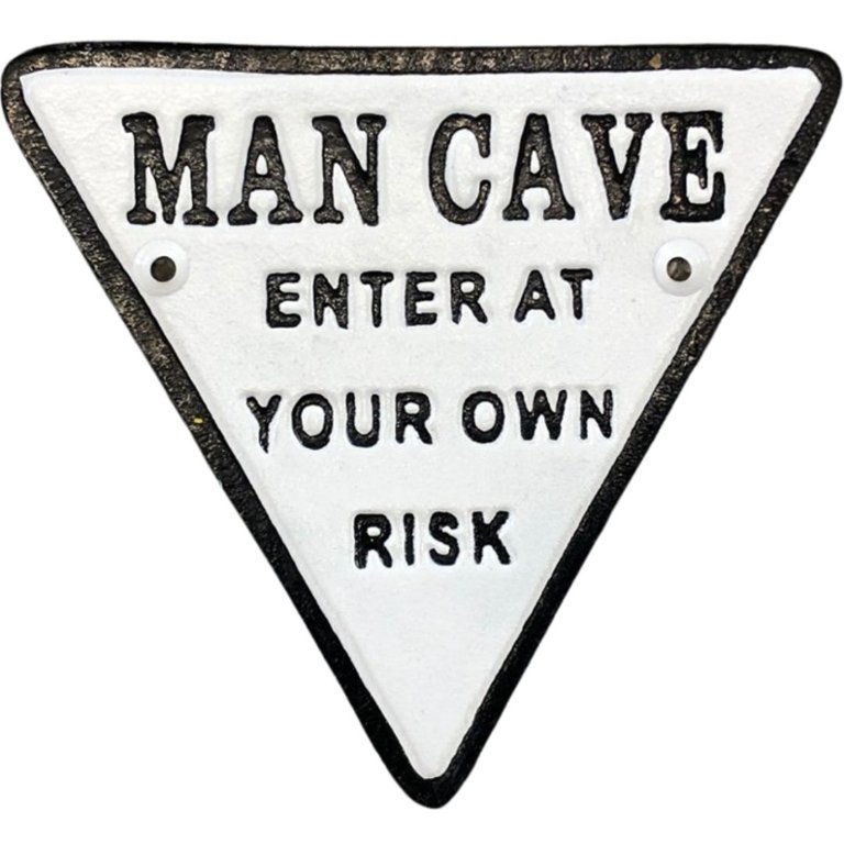 A black and white cast iron triangular "Man Cave" wall sign, measuring approximately 7 inches in height and 7 inches in width, is a bold and stylish addition to any space designated as a sanctuary for relaxation and leisure. Crafted from durable cast iron, this sign features a sleek design with the words "Man Cave" printed in prominent white letters against a black background.