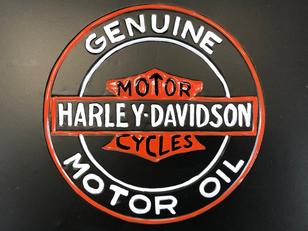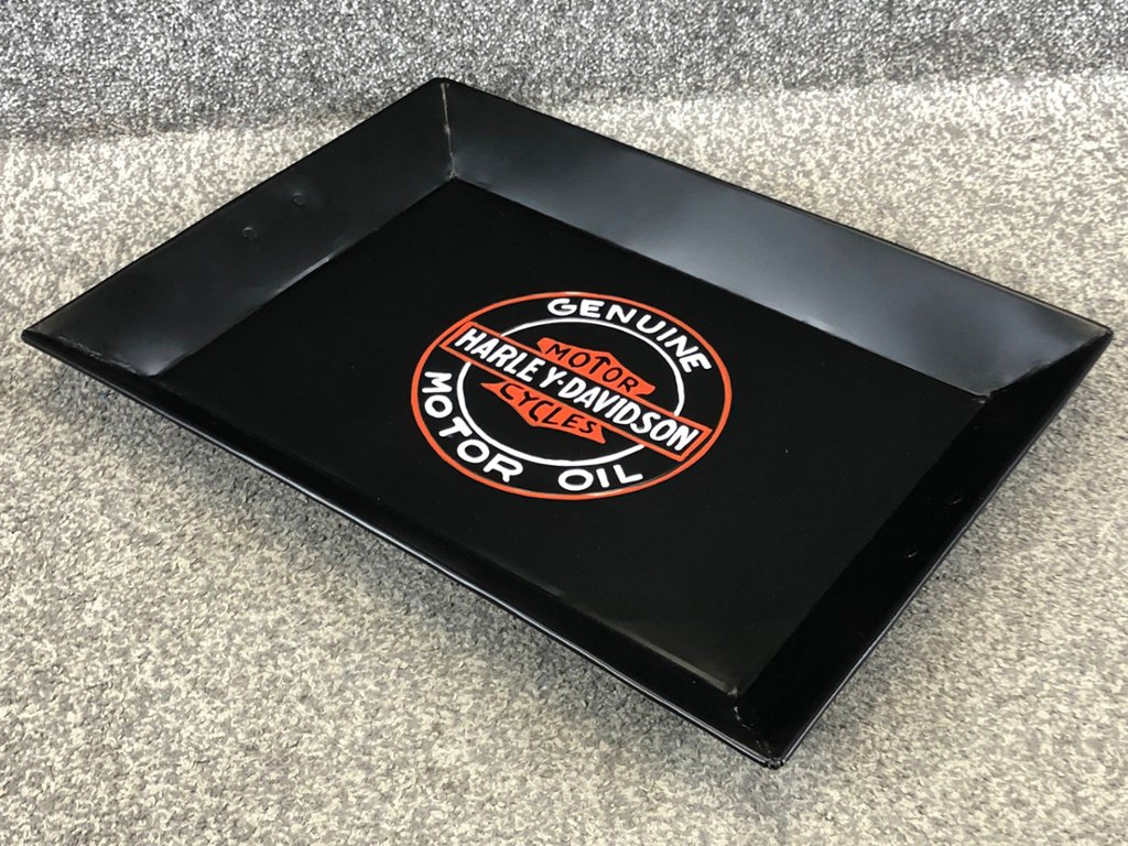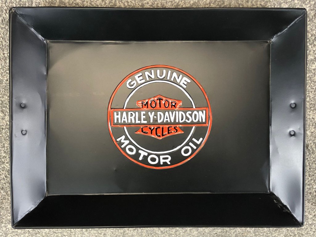 A black metal Harley Davidson serving tray. Approx 15" height, 20" width.