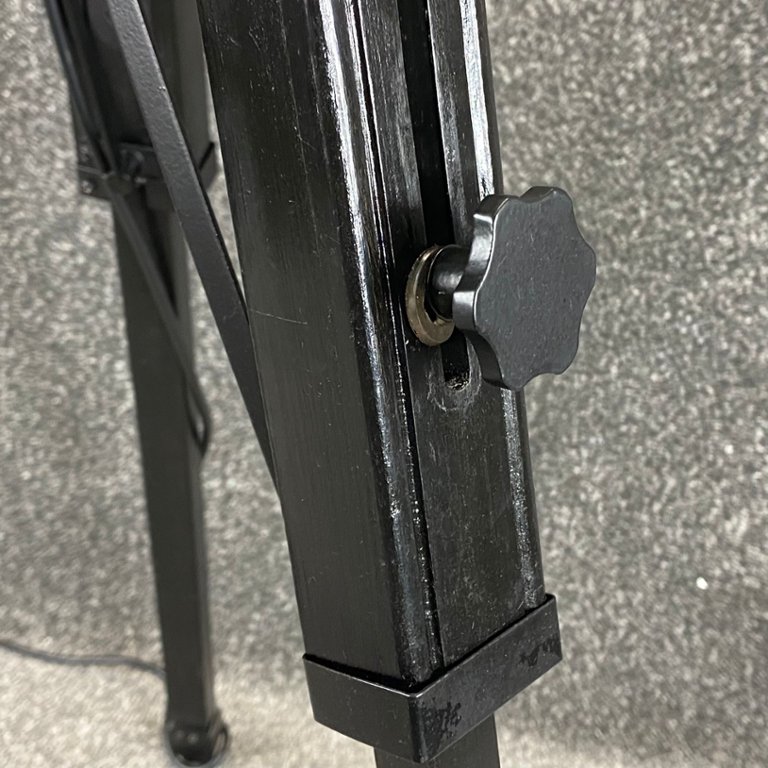 Supported by sturdy wooden tripod legs finished in matching black, the lamp exudes stability and balance. The legs are adjustable, allowing for customizable height and positioning to suit any space or ambiance. Whether casting a soft glow in a cozy corner or illuminating a grand room, this lamp adapts effortlessly to its surroundings, adding depth and character to any environment.
