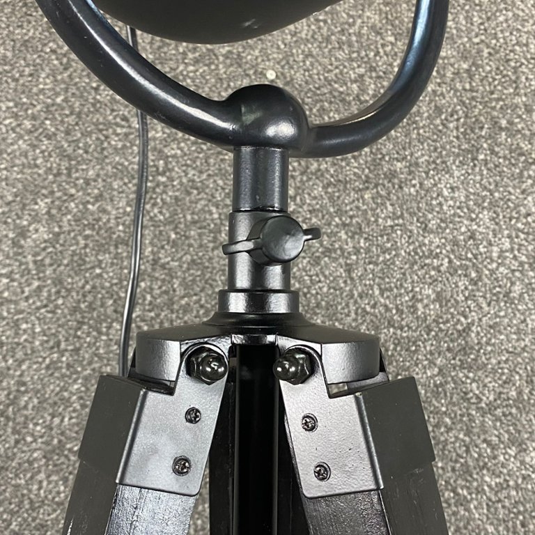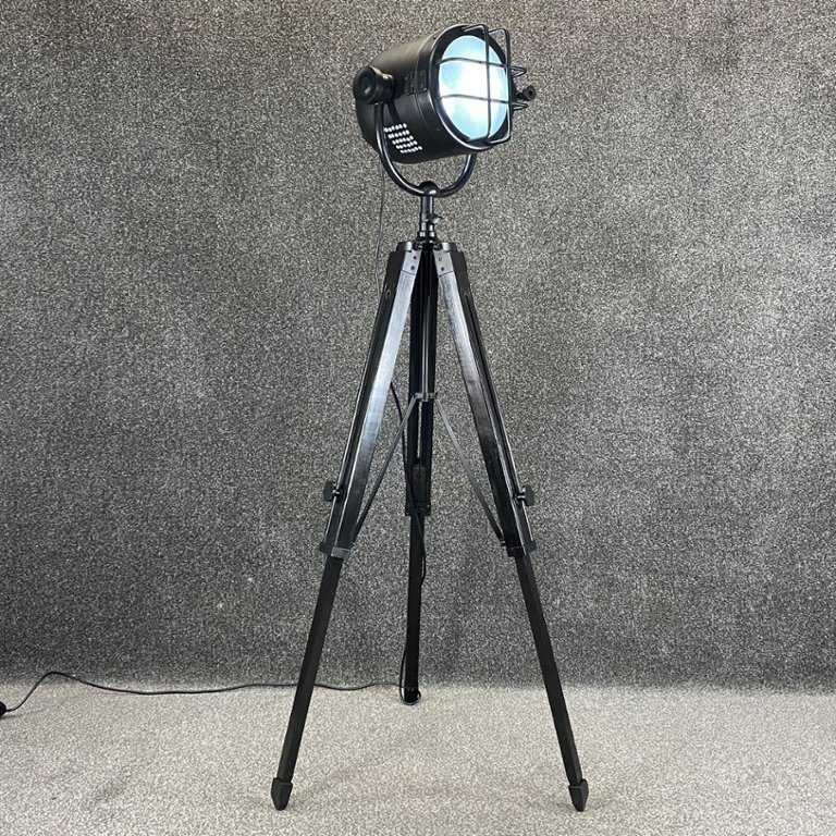 Introducing the epitome of industrial elegance, behold the Black Metal Cannon Lamp on its commanding black wooden adjustable tripod legs. Standing at approximately 55 inches in height and boasting a substantial width of 23 inches, this lamp is a statement piece that effortlessly merges functionality with striking aesthetics.