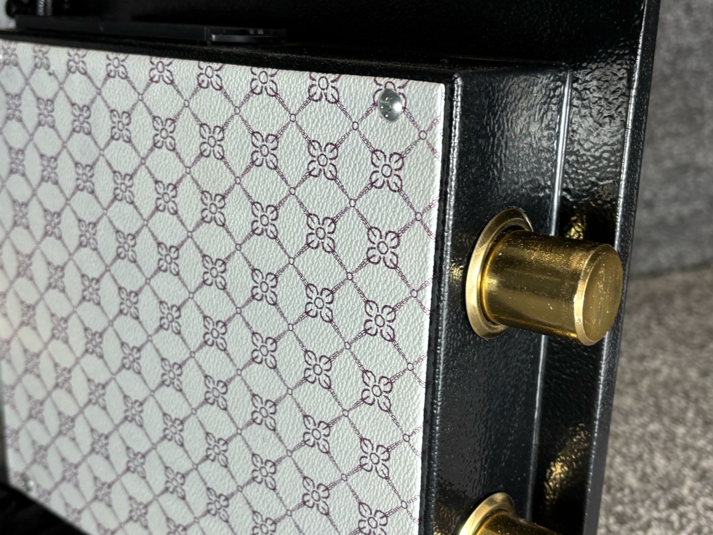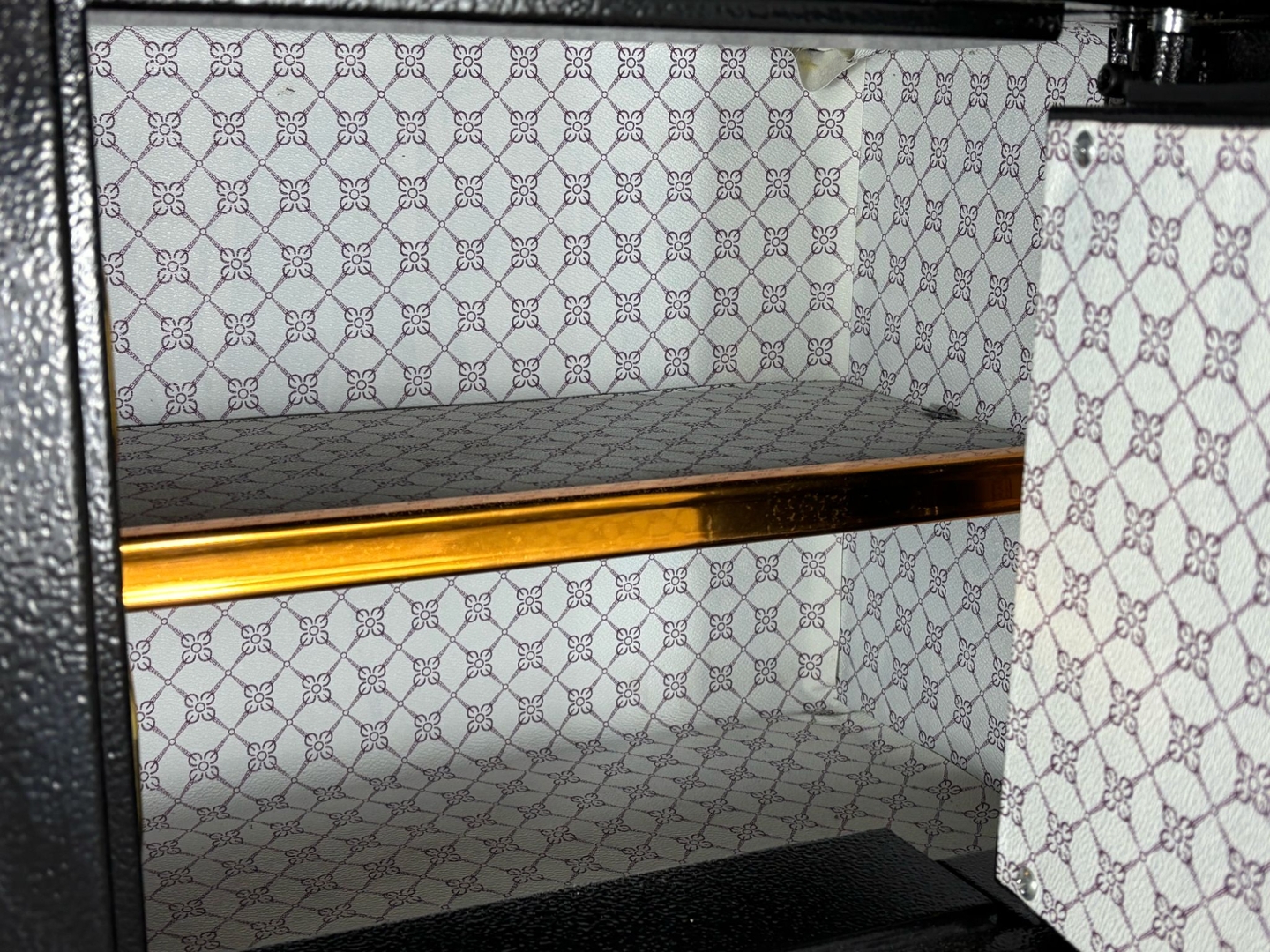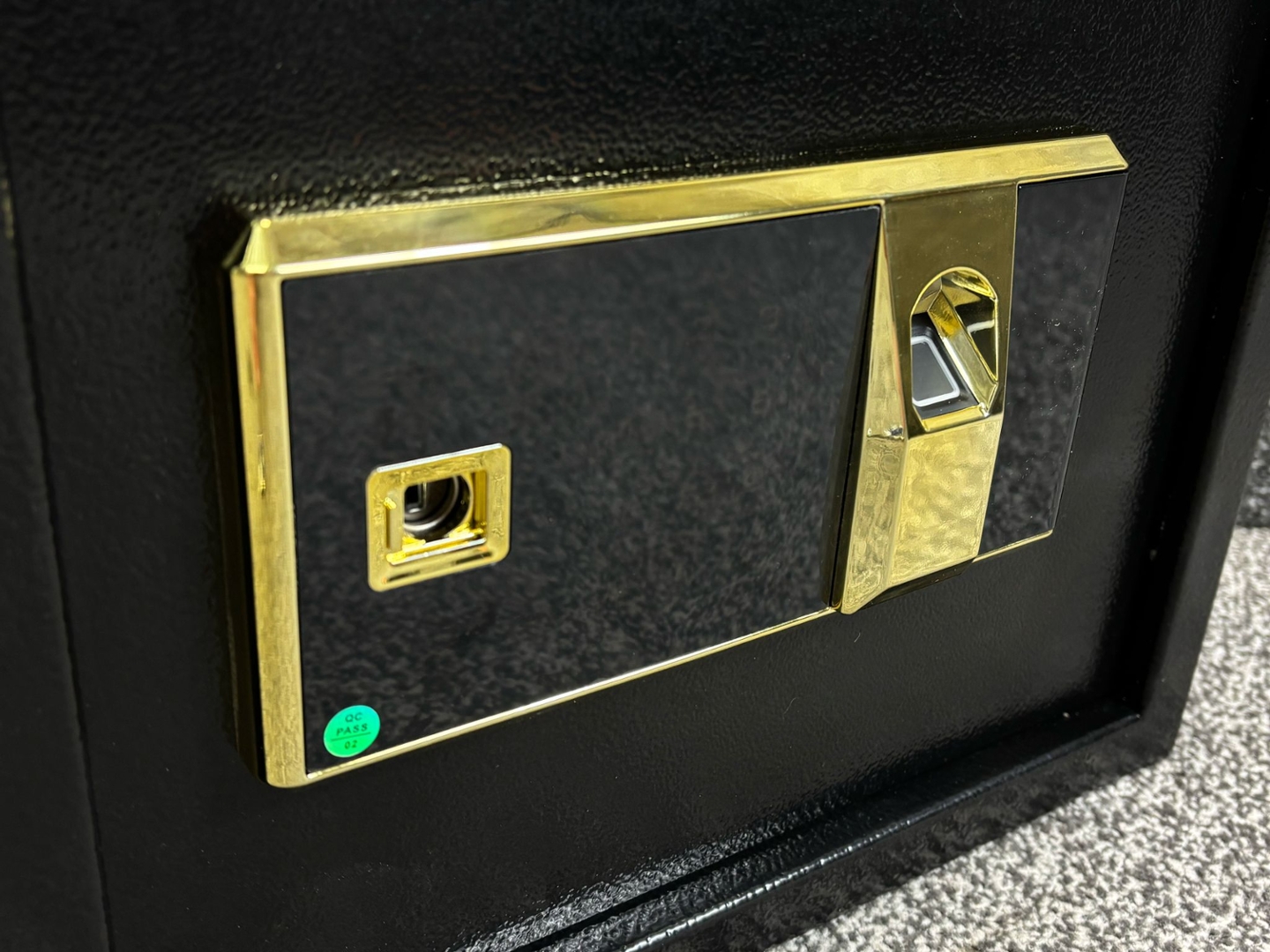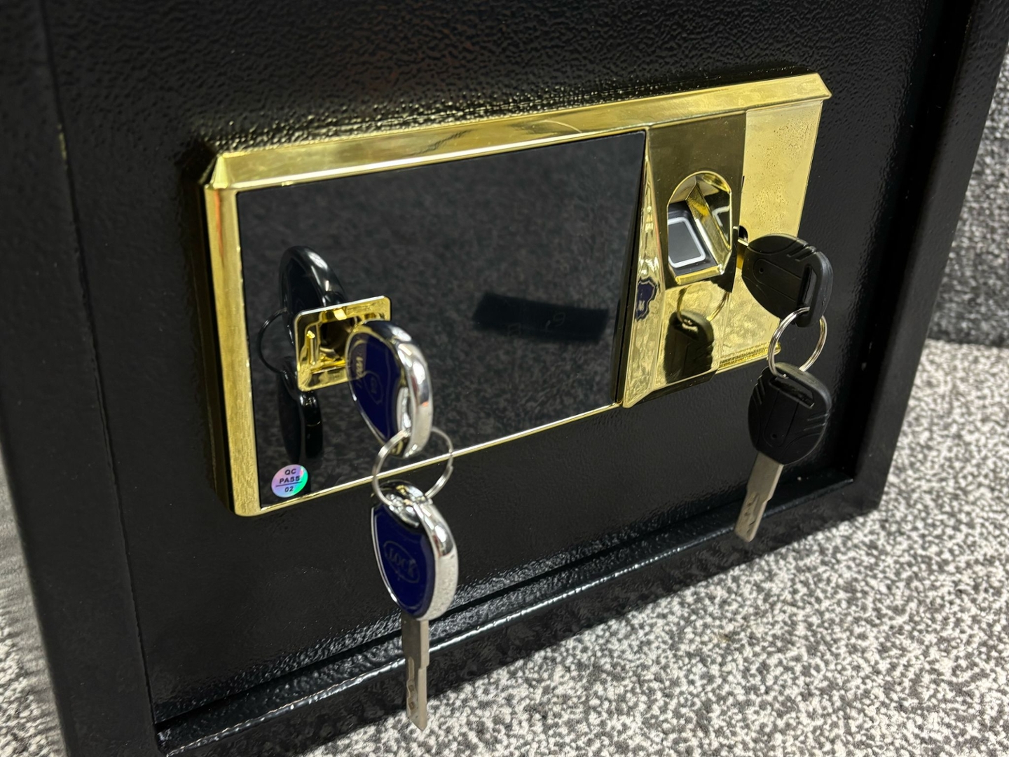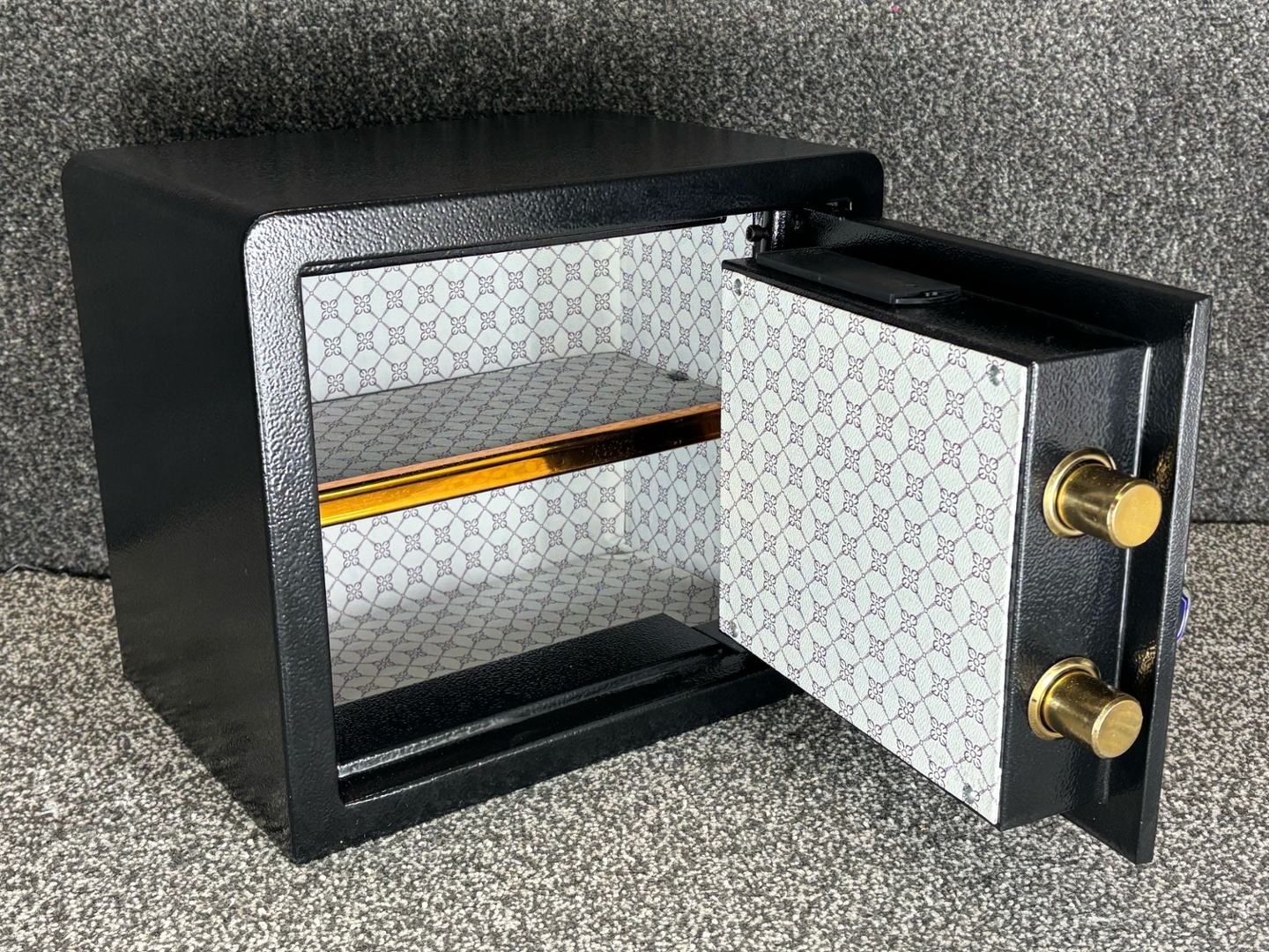 Despite its smaller footprint measuring approximately 30cm in height, 35cm in width, and 25cm in depth, this safe doesn’t compromise on functionality. Inside, you’ll find a well-organised interior complete with a shelf and a secure locking compartment, ideal for safeguarding passports, important documents, jewellery, or cash. The elegant black finish is enhanced by a stylish gold-accented interface that complements any setting. For peace of mind, it comes fully equipped with wall bolts for secure mounting, an exterior backup power pack for emergency access, and a set of override keys. A brilliant blend of convenience, security, and sleek design in a perfectly sized package.