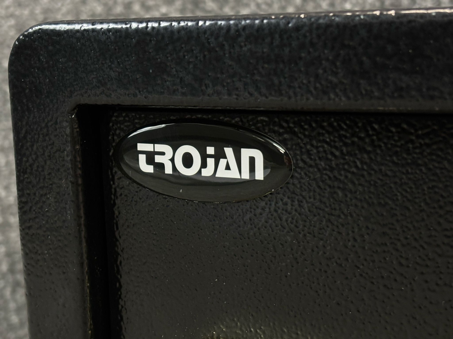 A Trojan fingerprint recognition safe, with a locking separate compartment and shelf to the interior, an incorrect fingerprint internal alarm, complete with wall bolts, exterior backup power pack and backup keys. Approx 30cm height, 35cm width, 25cm depth.
