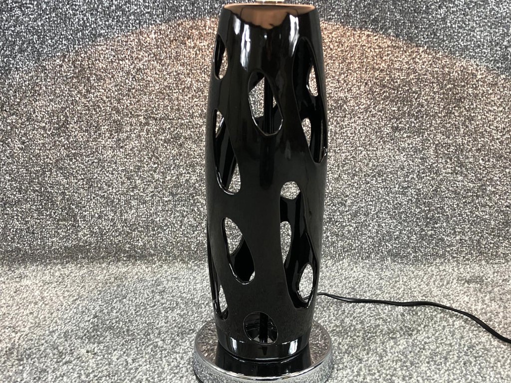A black table lamp blends modern flair with artistic elegance, making it a standout accent in any room. Standing approximately 26 inches high and 15 inches wide, it features a sleek black body set upon a shimmering chrome base, creating a dynamic contrast that exudes contemporary sophistication. The sculpted cut-out design in the lamp’s body adds depth and intrigue, allowing light to reflect beautifully off its glossy finish.