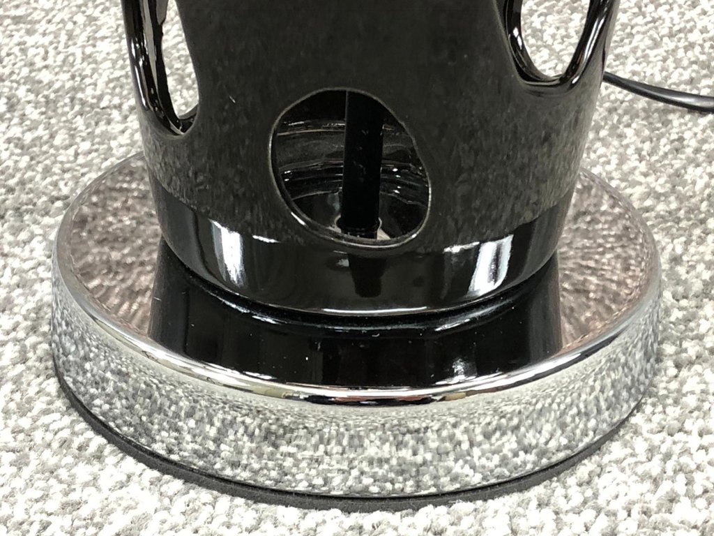 A black table top lamp on a chrome base with a black & silver shade. Approx 26" height, 15" width.