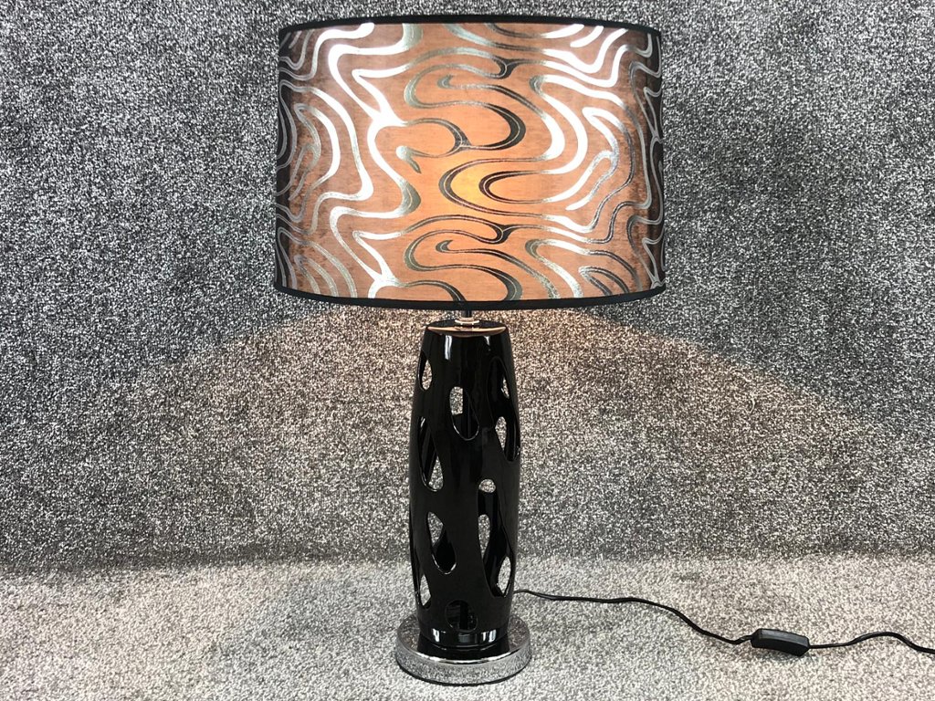 Topping the piece is a bold black and silver patterned shade, its swirling metallic design radiating a sense of movement and luxury. When illuminated, the shade casts a warm, inviting glow while showcasing its eye-catching texture and sheen.