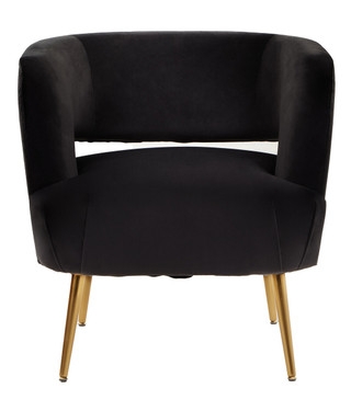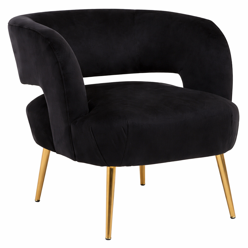 A Black Velvet Curved Cut-Out Design Lounge Chair on gold finish metal legs.