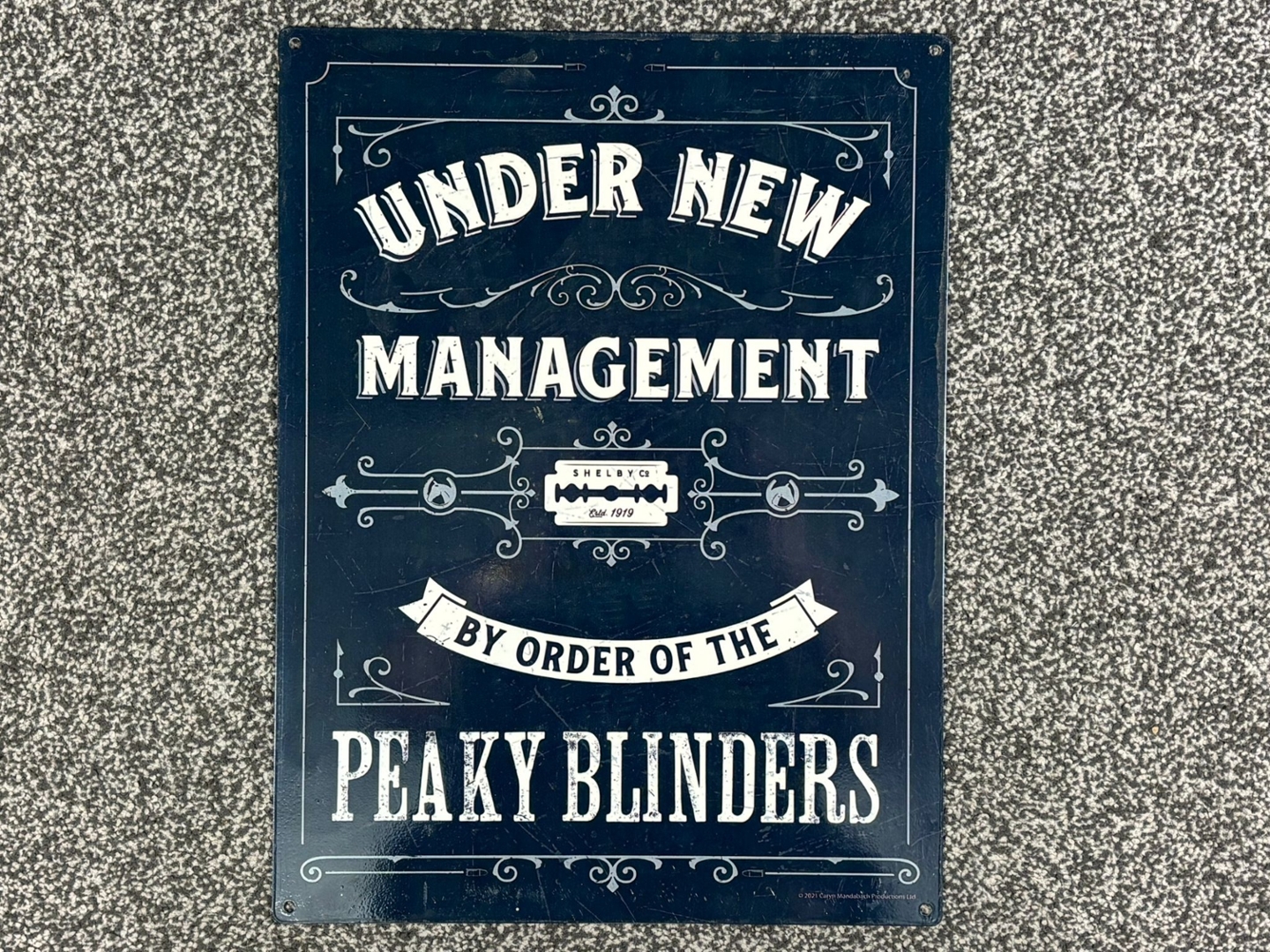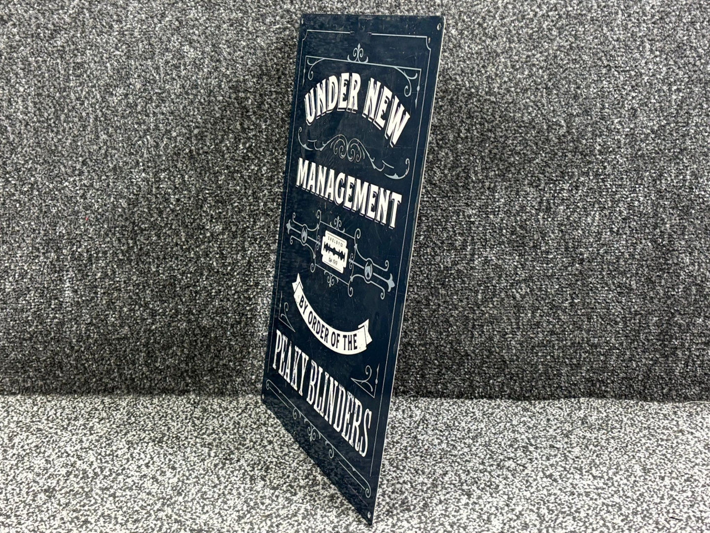 An aluminium Peaky Blinders wall mountable sign. Featuring a bold blue background with crisp white lettering, this piece pays homage to the hit television series with the phrase: “Under New Management – By Order of the Peaky Blinders.” Measuring approximately 40cm in height and 30cm in width, it’s the perfect size to make a statement without overwhelming your space.