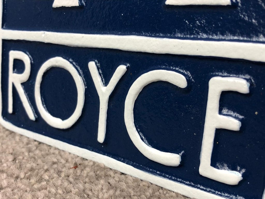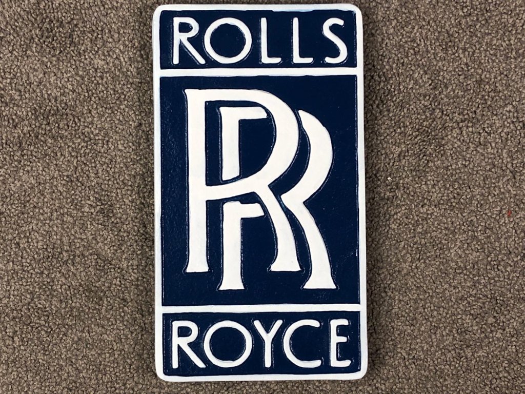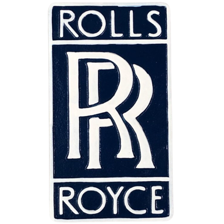 A blue and white metal Rolls-Royce wall plaque. Measuring approximately 12 inches in height and 7 inches in width, this eye-catching piece pays tribute to one of the most prestigious names in automotive history. The iconic double “R” monogram is proudly featured at the centre, encased between bold “ROLLS” and “ROYCE” lettering in a clean, art-deco-inspired font, all beautifully set against a deep navy background.