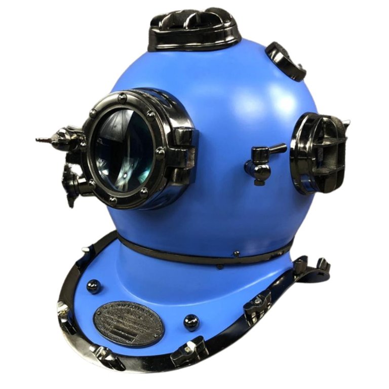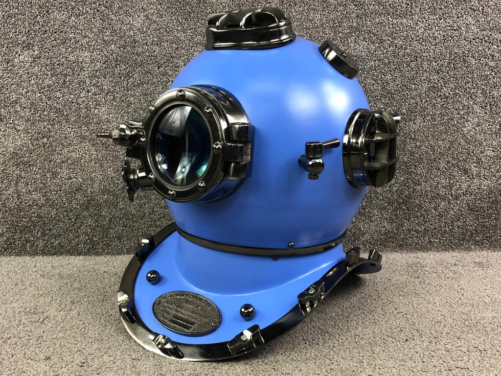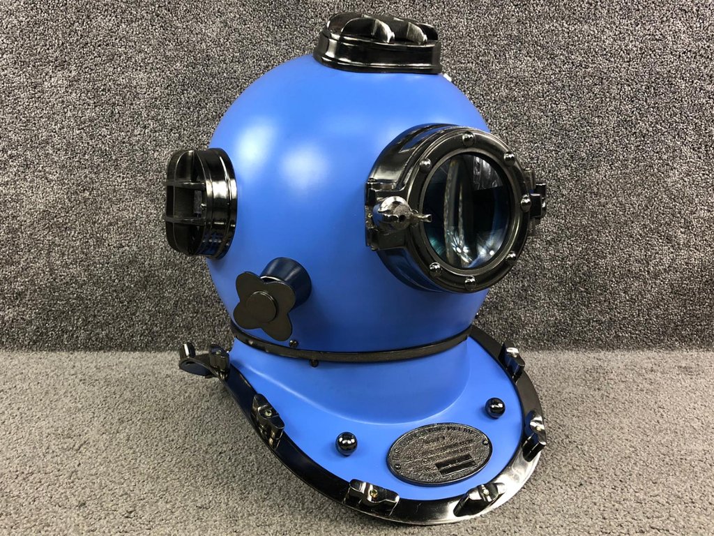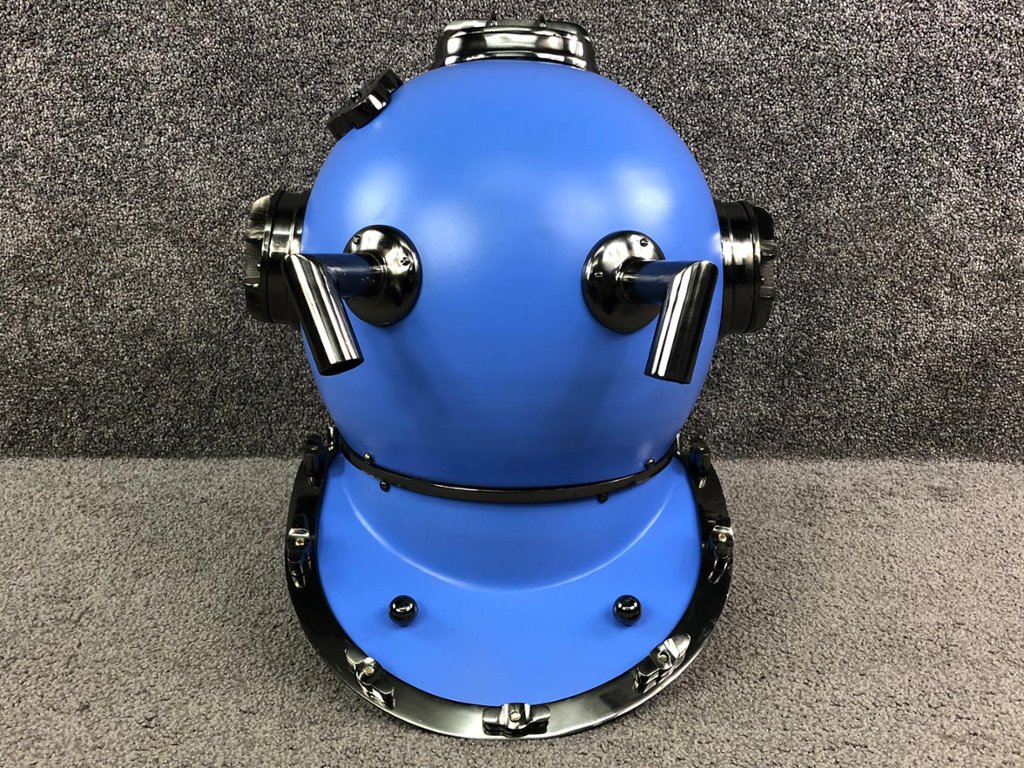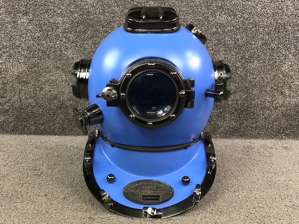 Crafted with meticulous attention to detail, the replica helmet faithfully recreates the iconic design of the US Navy diving apparatus. The vibrant blue hue, accented by gleaming chrome details, captures the spirit of adventure and exploration associated with deep-sea diving.