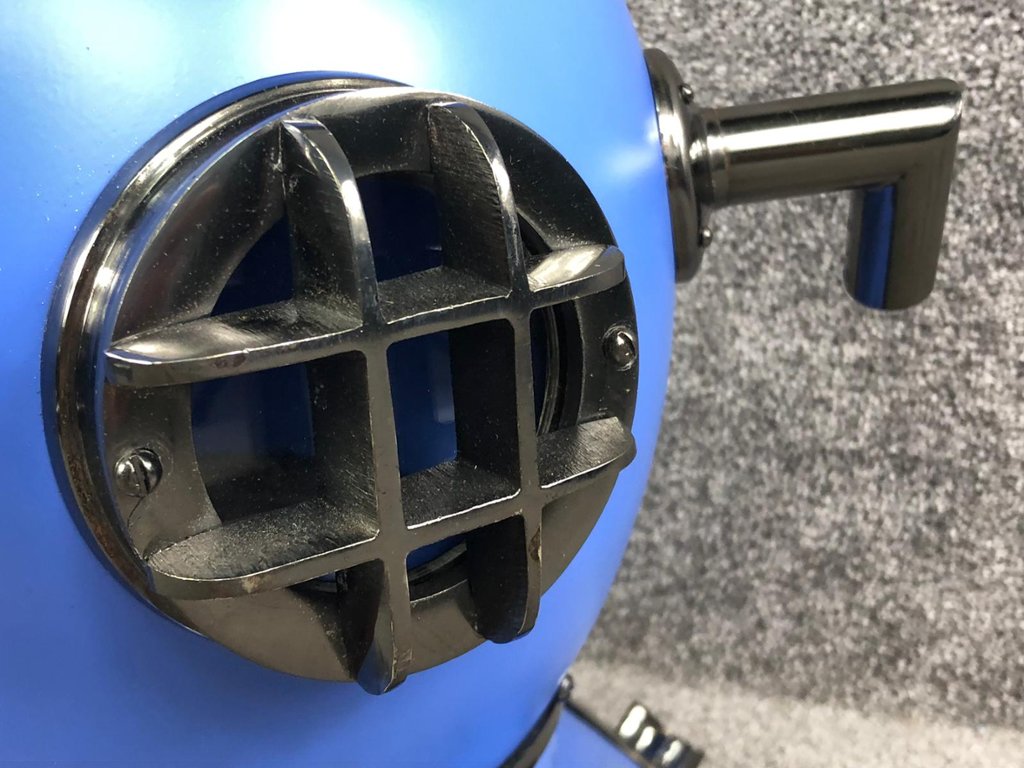 A replica blue and chrome US Navy divers helmet. Approx 18" height, 12" width, 17" depth.