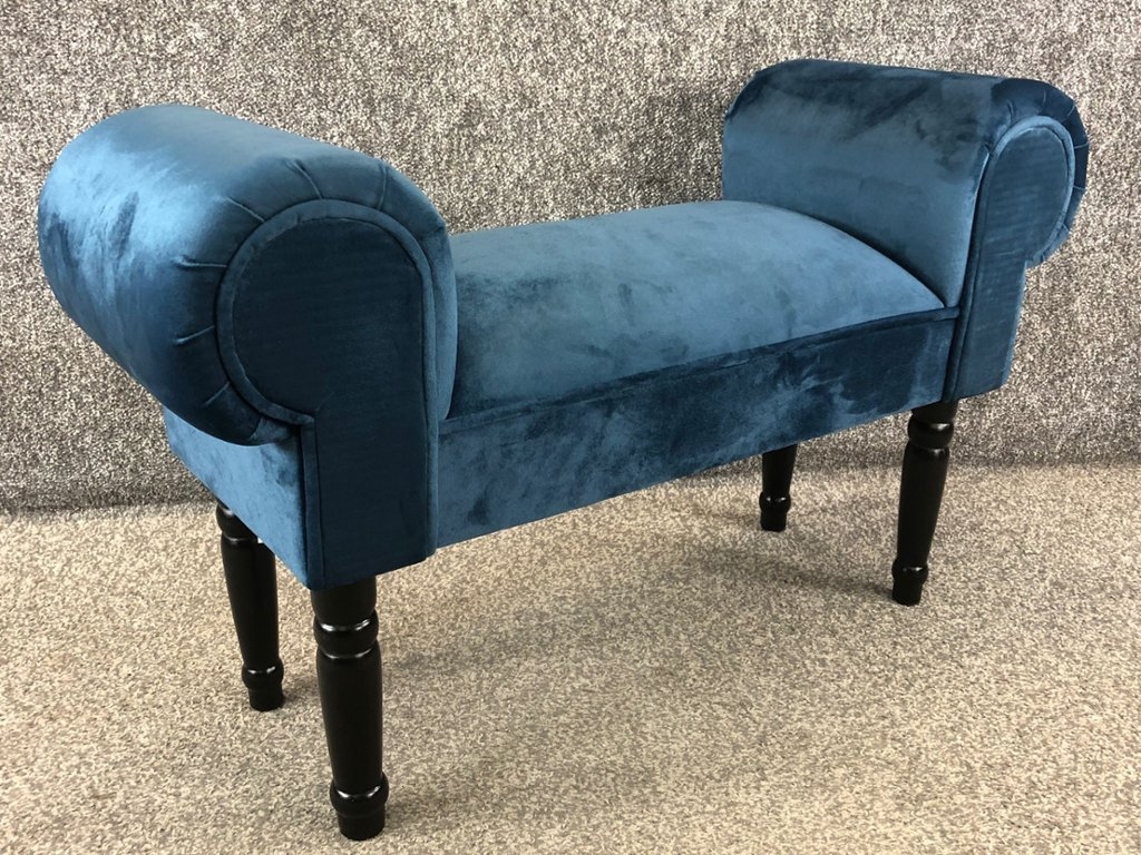 A blue french velvet double ended daybed design foot stool on black wooden legs. Approx 20" height, 33" width, 12" depth.