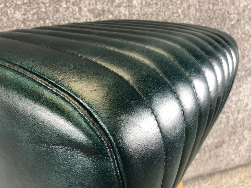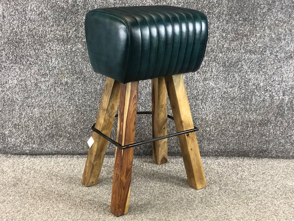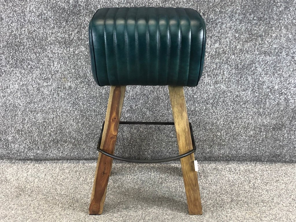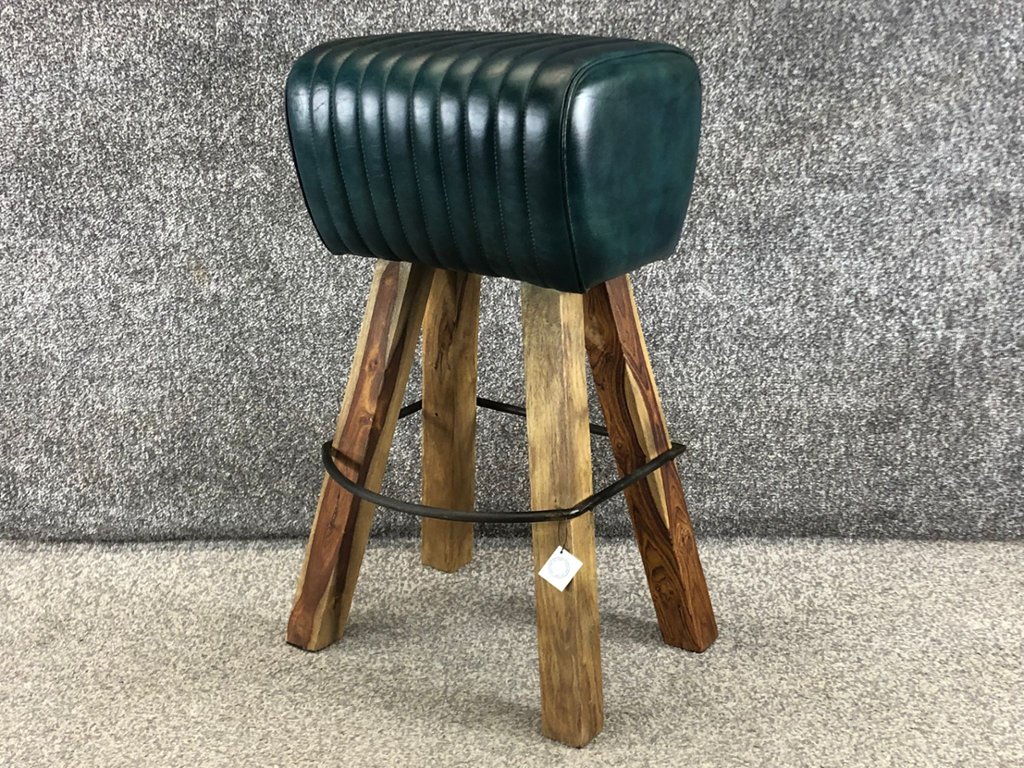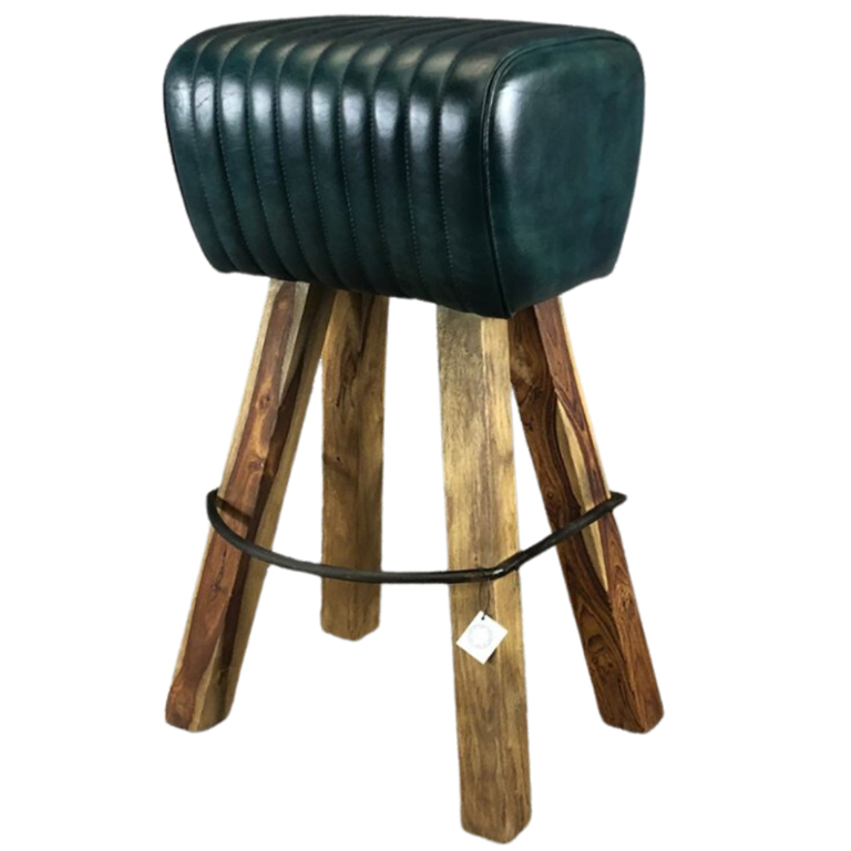 A Blue Leather Fan Design Bar Stool on Long Wooden Legs with a Dark Metal Foot Trim. This distinctive bar stool combines elegance with contemporary design, offering both style and comfort in equal measure.
