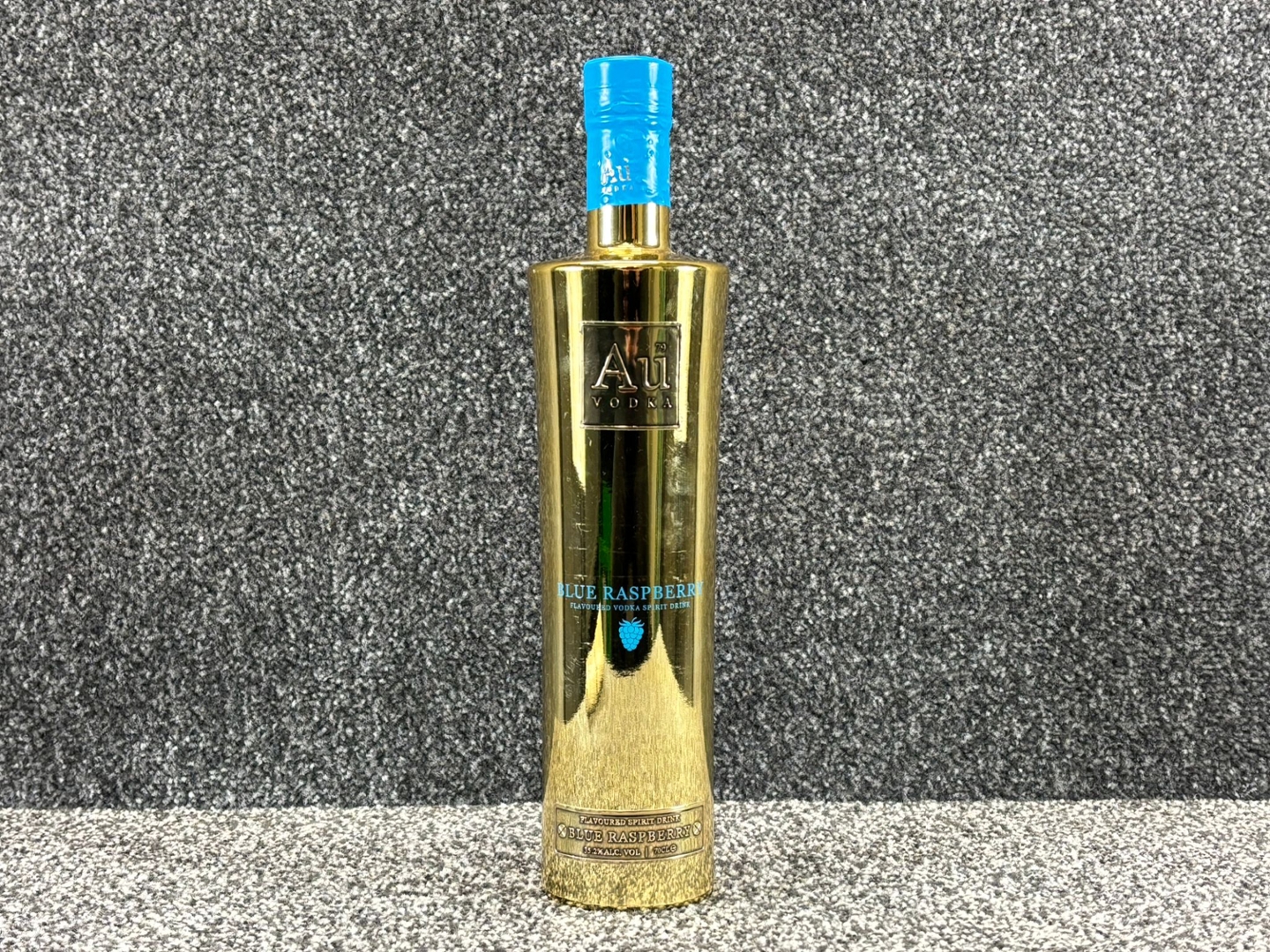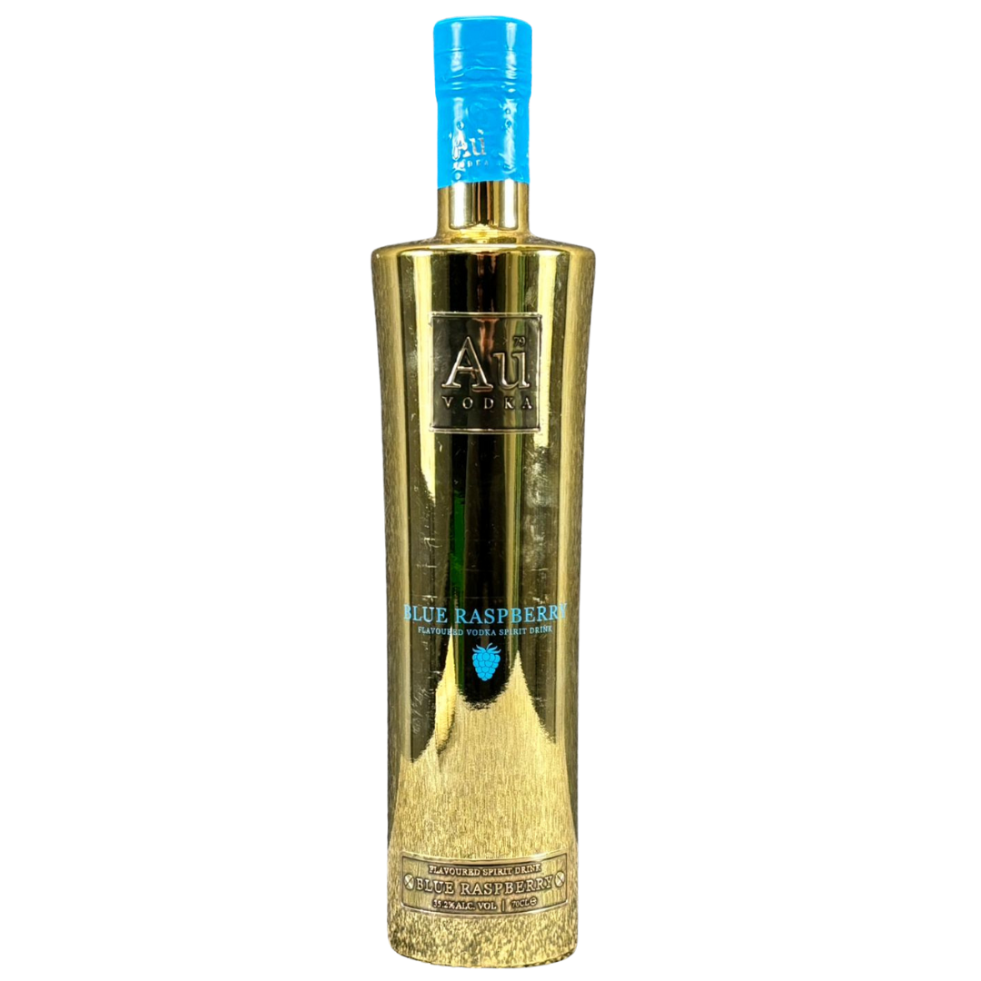 A 70cl bottle of AU Vodka Blue Raspberry stands out with its