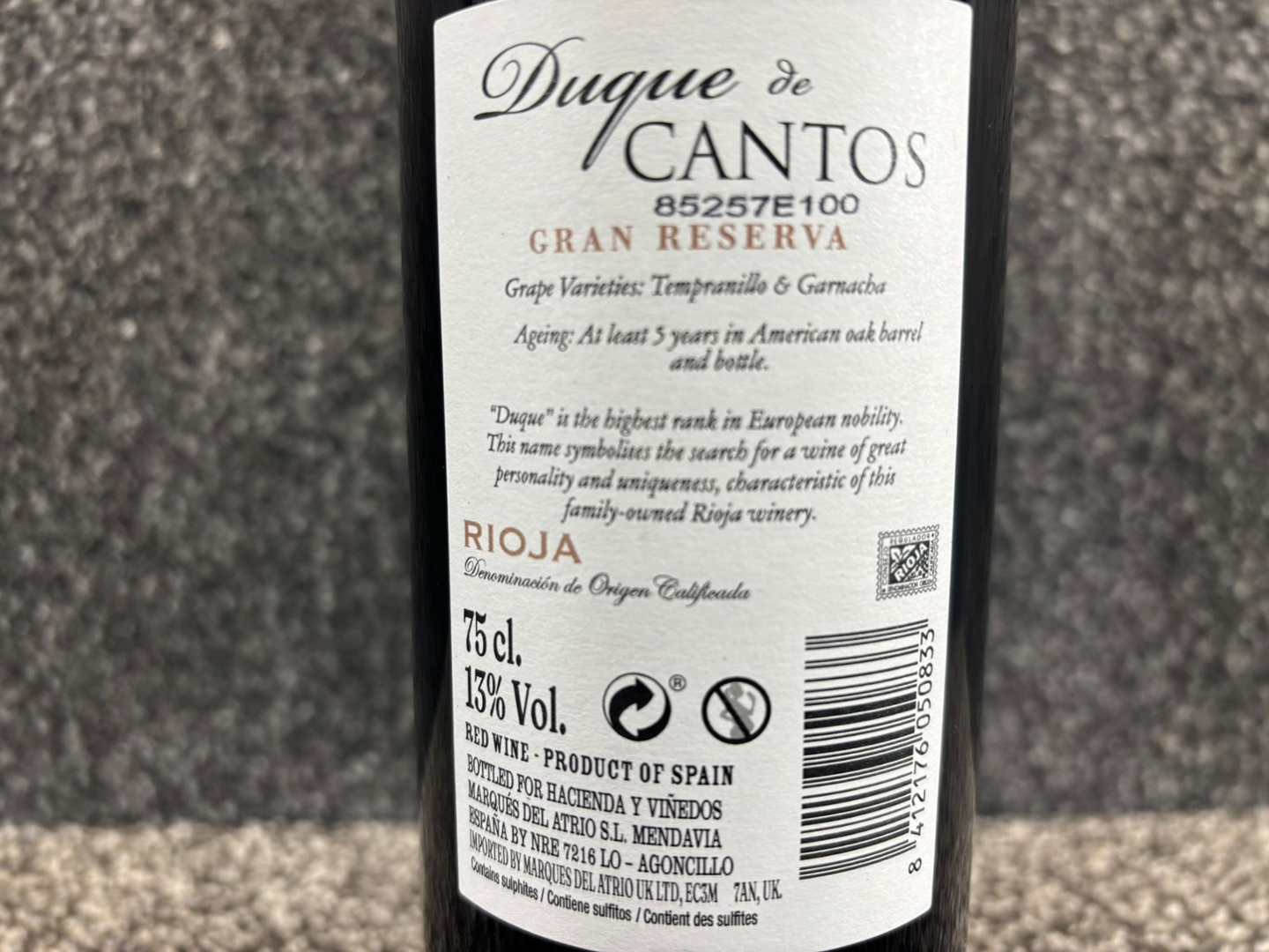 A bottle of 2017 Duque de Cantos Gran Reserva Rioja. 750ml.
