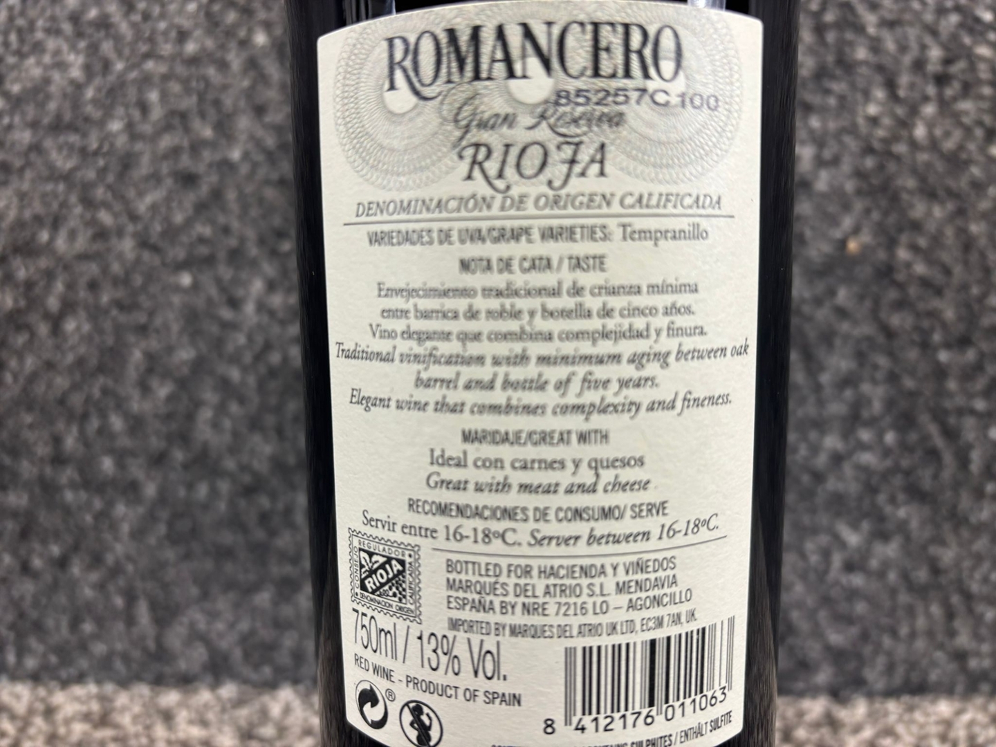- > Bottle of Romancero Gran Reserva Rioja
