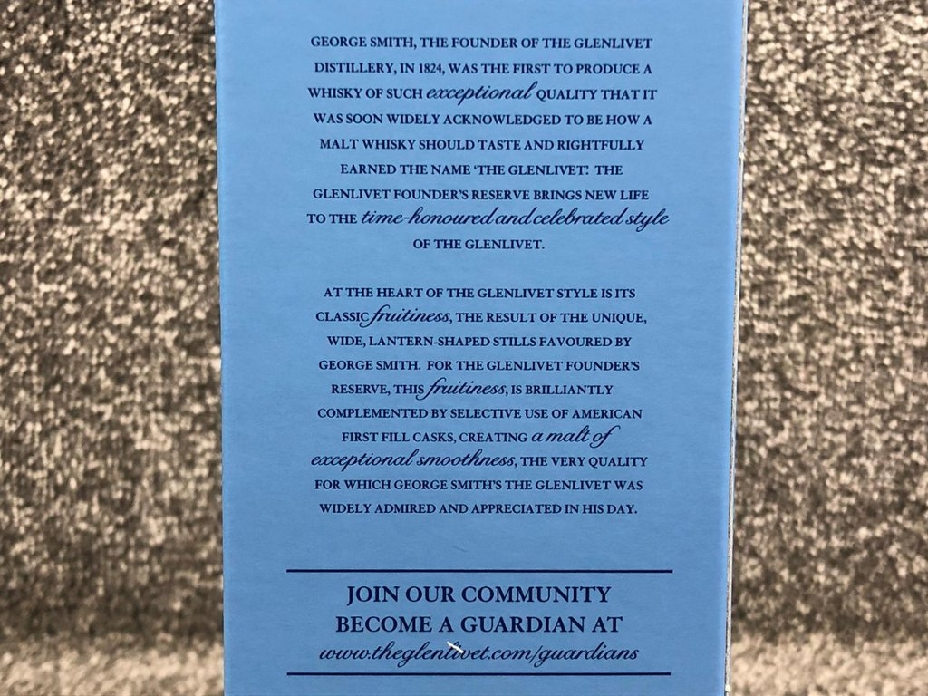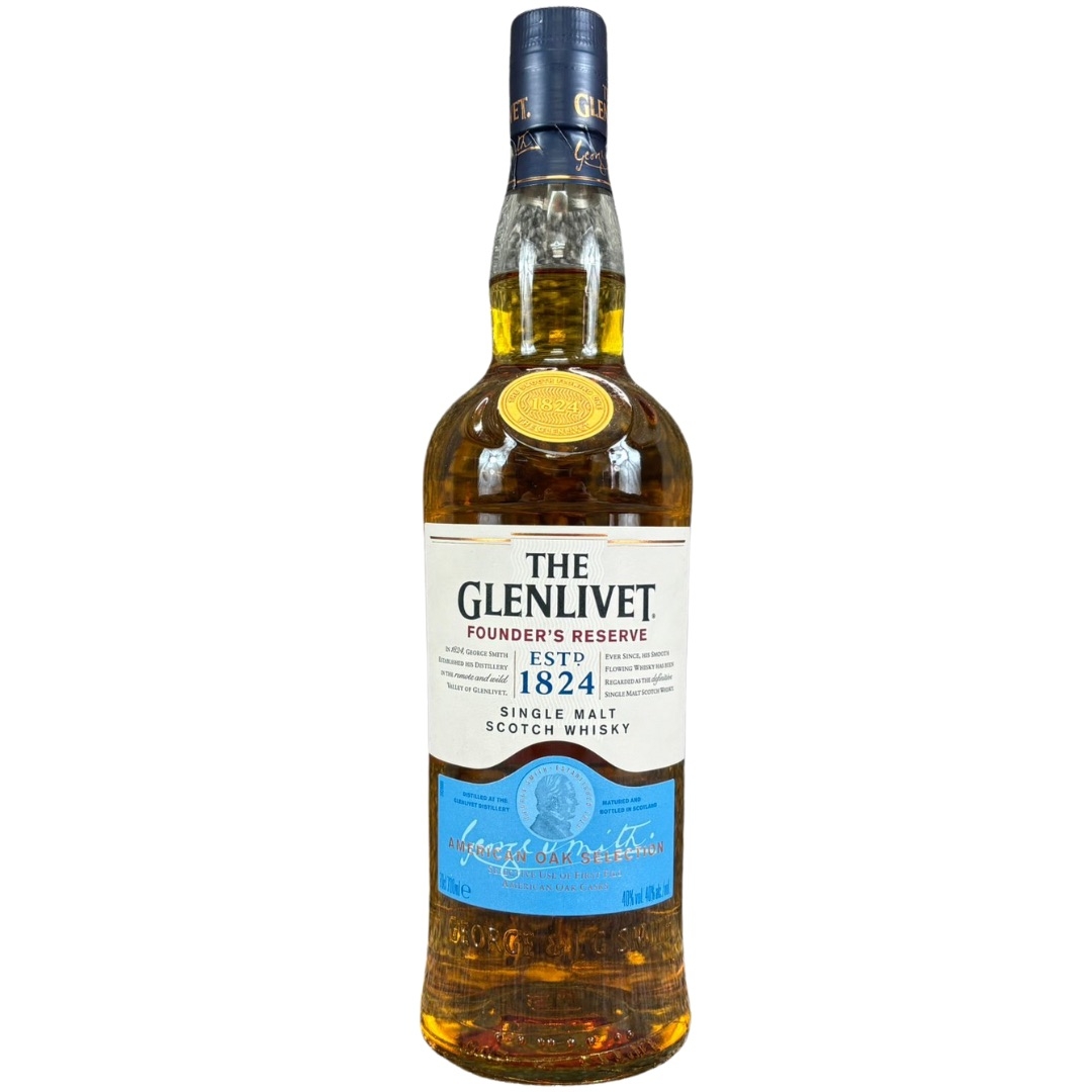 A bottle of The Glenlivet Founder's Reserve Single Malt Scotch Whisky—a true celebration of heritage and craftsmanship. Presented in a sleek 70cl bottle, this exquisite whisky pays tribute to the legacy of George Smith, the visionary founder of The Glenlivet Distillery, established in 1824. The Founder's Reserve embodies smoothness and balance, making it the perfect introduction to single malts.