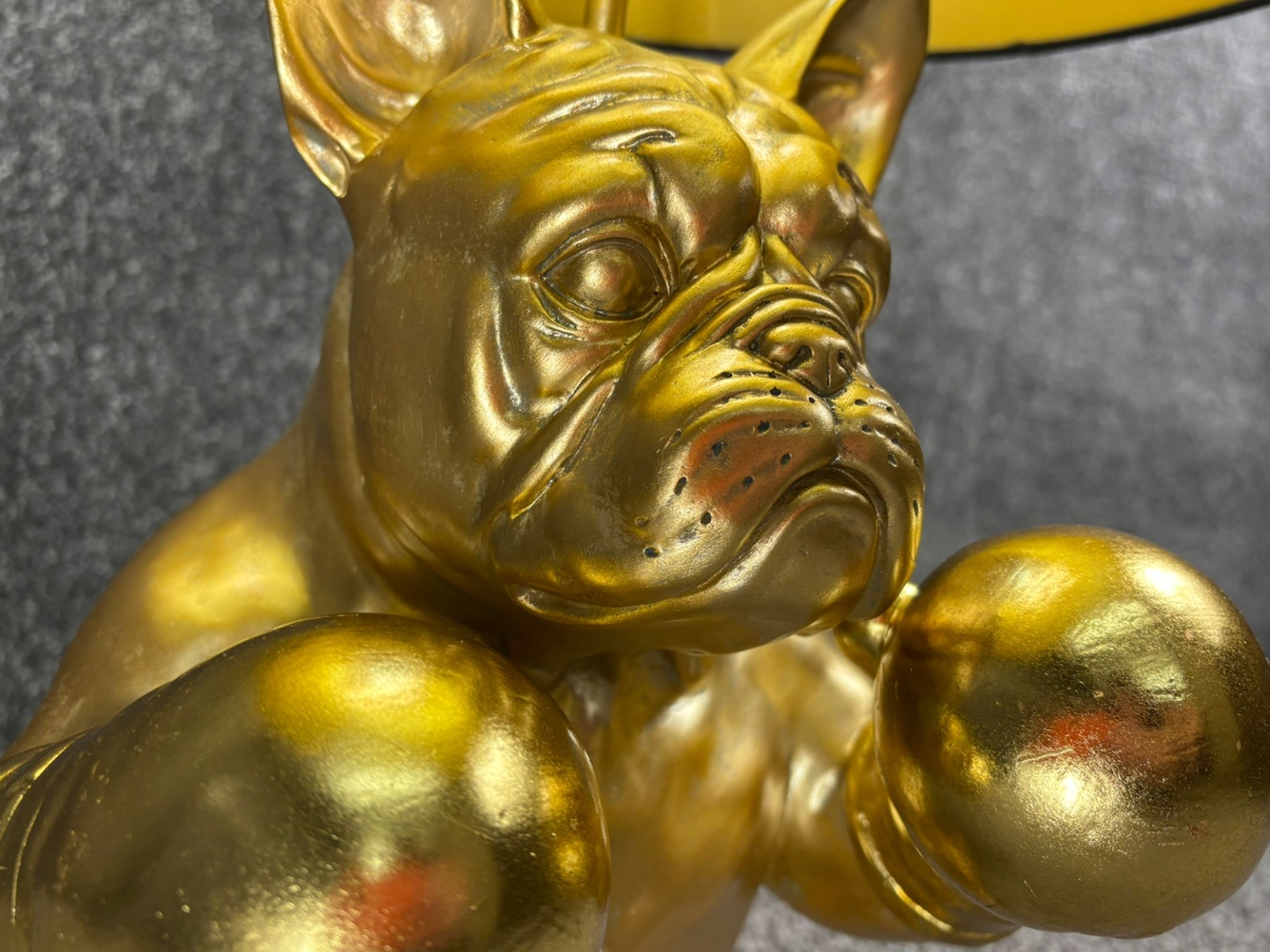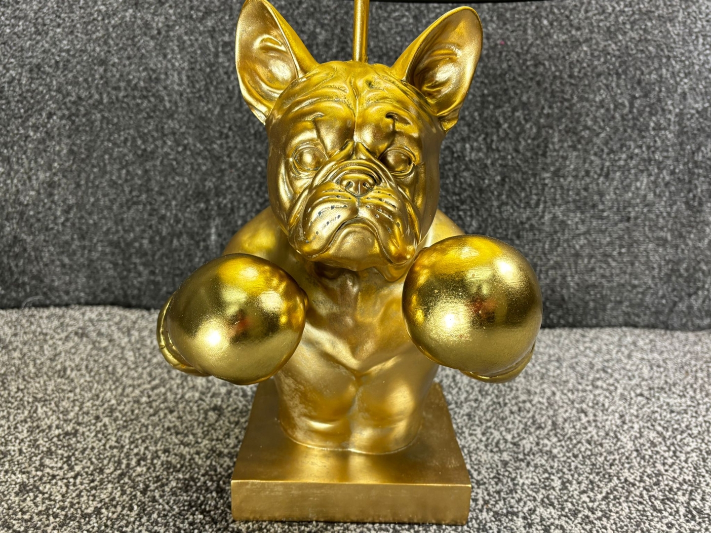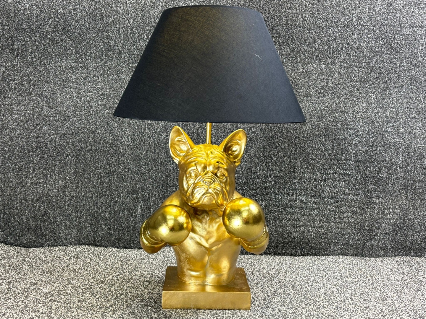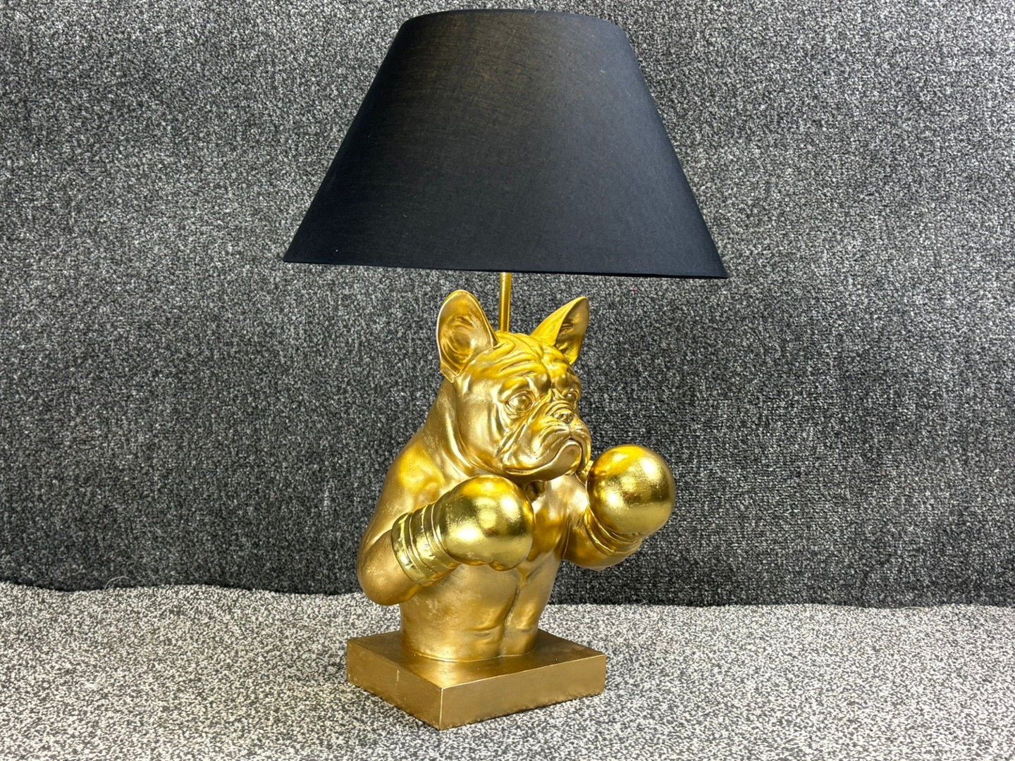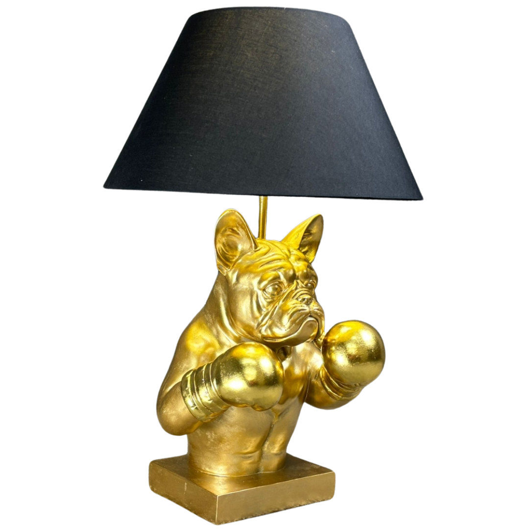 A Boxer Bulldog Lamp, a unique fusion of fierce style and playful charm. Standing approximately 55cm tall and measuring 36cm in both width and depth, this bold statement piece features a muscular bulldog sculpted in gleaming gold, complete with raised boxing gloves and an intense, ready-for-the-ring expression.