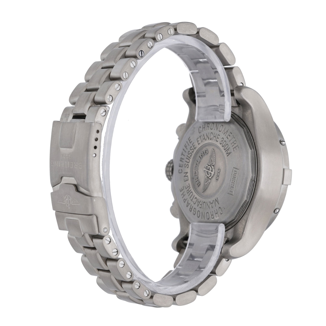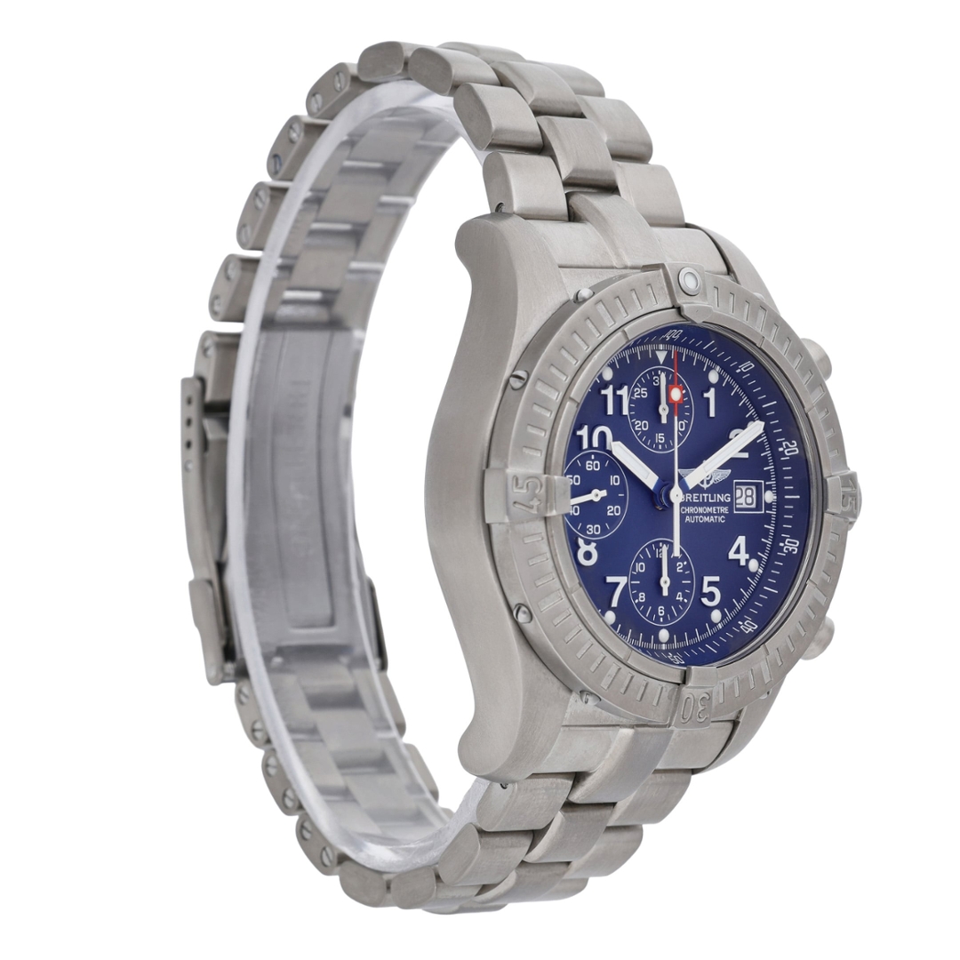 A Breitling Avenger Watch crafted in lightweight titanium, combining robust engineering with the bold, functional design that defines the Avenger collection. Built for extreme durability and professional performance, the Avenger line is designed to withstand demanding environments while maintaining the precision and reliability expected from Breitling’s aviation-inspired timepieces.