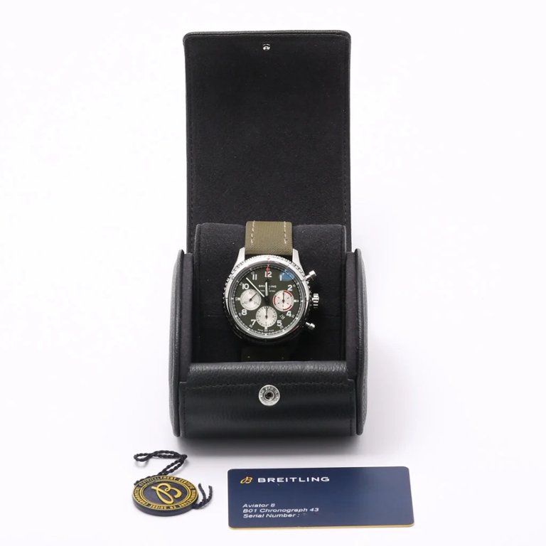 A Breitling Aviator 8 Watch, model AB0119, is a distinguished timepiece that combines robust functionality with refined aesthetics. This 2022 model features a striking 43mm stainless steel case, offering a sturdy yet sophisticated look that is both timeless and contemporary. The green dial, a unique and eye-catching feature, is complemented by luminous hands and markers, ensuring optimal readability under various lighting conditions.