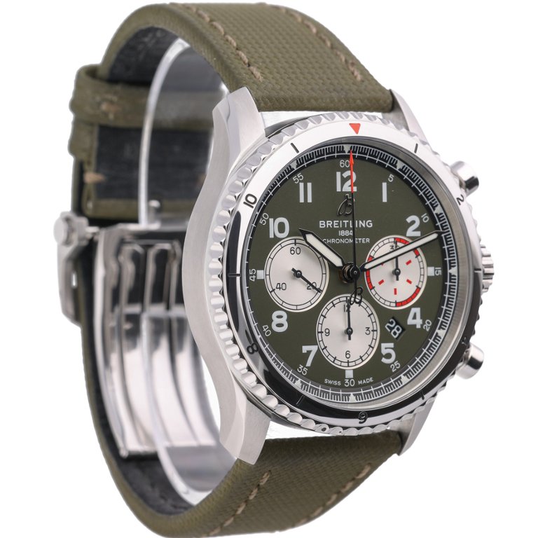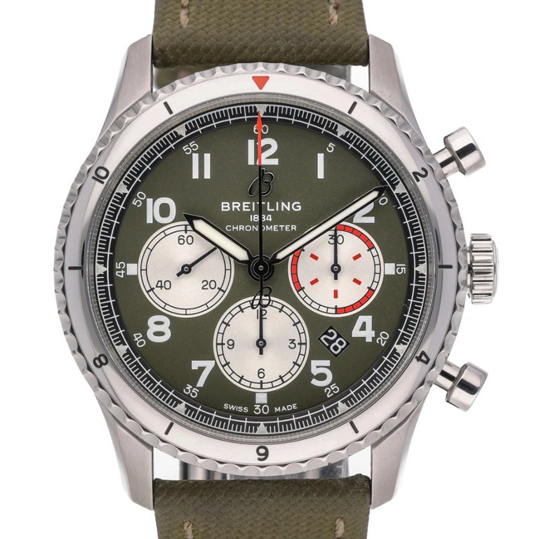 With its blend of classic design elements and modern features, the Breitling Aviator 8 Watch is not only a statement of style but also a testament to Breitling's enduring legacy of excellence in watchmaking. This model, with its green dial and strap, stands out as a unique and refined accessory suitable for any occasion.