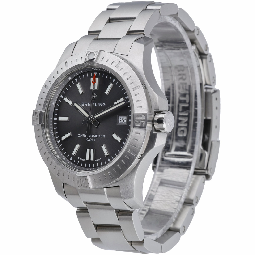 A Breitling Colt reference A17313, presented in stainless steel with a sleek grey sunburst dial, offering a clean, highly legible design. The 41mm case is defined by its robust construction and distinctive unidirectional bezel with rider tabs, delivering a strong, purposeful presence on the wrist. Bold applied hour markers and luminous hands ensure excellent visibility, while the red-tipped seconds hand adds a subtle yet striking contrast.