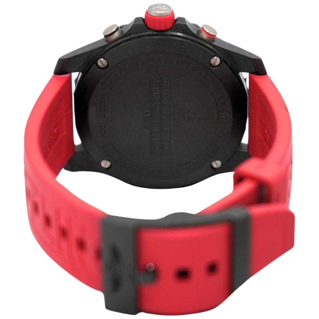 A Breitling Endurance Pro Watch, Red Rubber Strap with a Carbon Case and Clasp with a Black Bezel and Dial.
