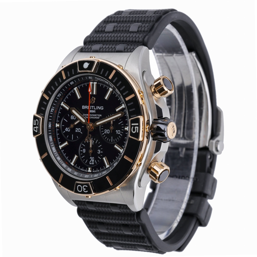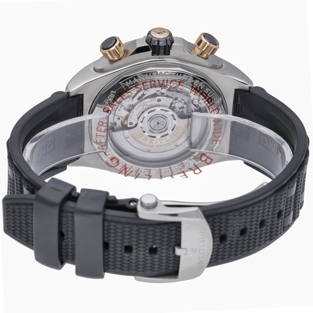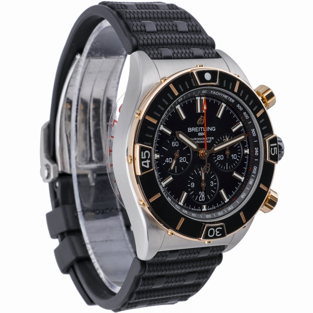A Breitling Super Chronomat Watch, Stainless Steel & Rose Gold with a Black Bezel & Dial.