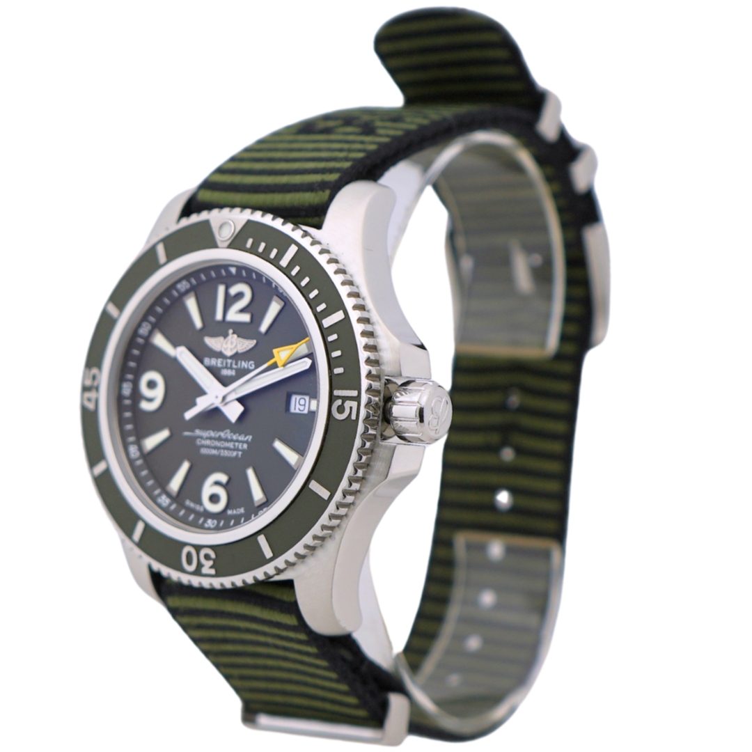 A Breitling Superocean II Automatic Watch, Fabric Khaki Green Strap with a Stainless Steel Case and Clasp on a Green Bezel and Dial