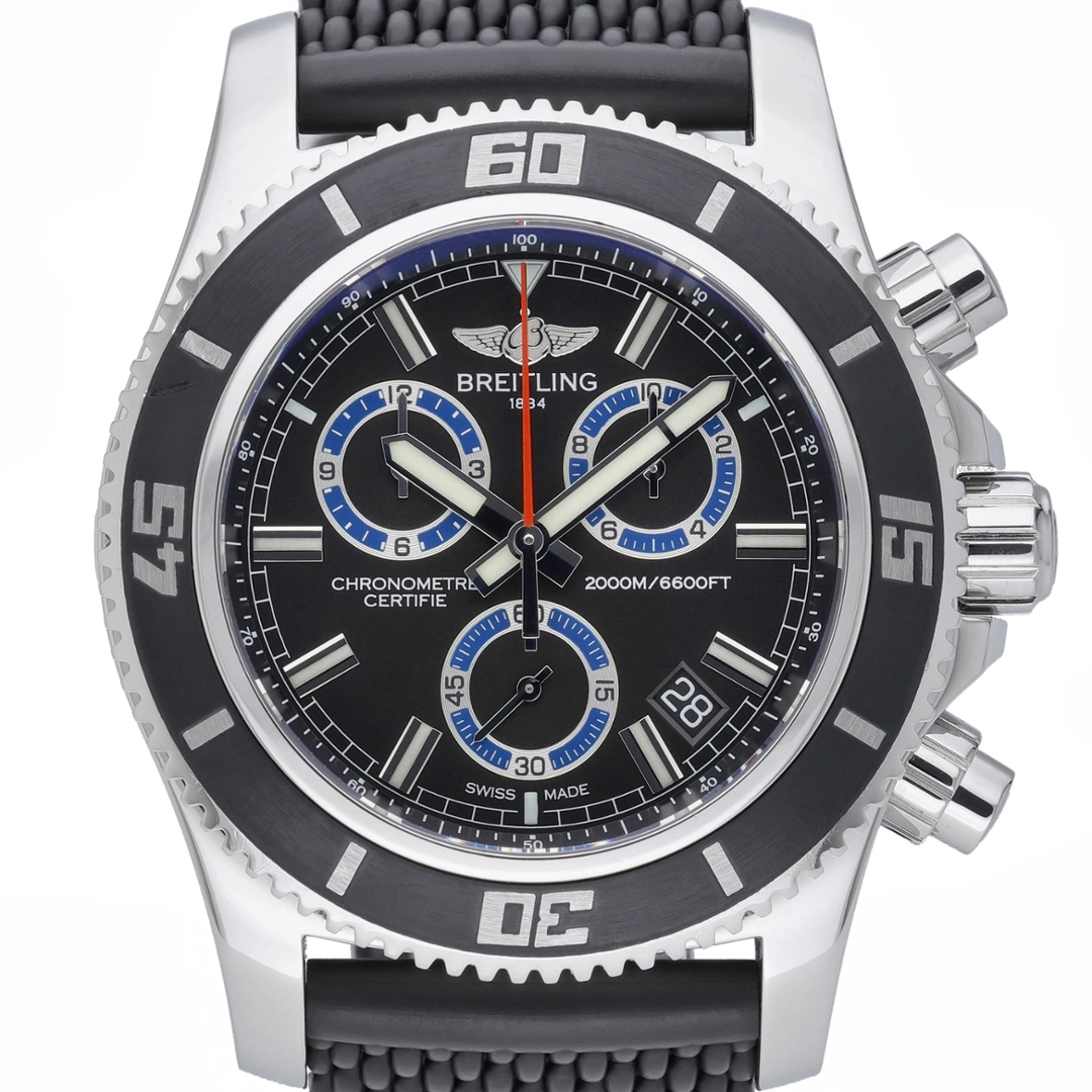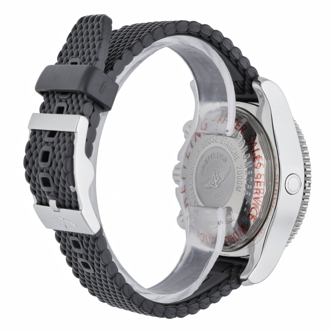 Completing the watch is a durable black rubber strap secured with a stainless steel clasp, designed to offer comfort and flexibility in demanding environments. Bold, highly capable, and engineered for serious underwater performance, the Breitling Superocean Chronograph stands as one of the brand’s most powerful professional dive watches.