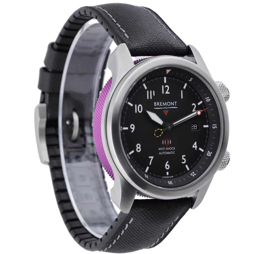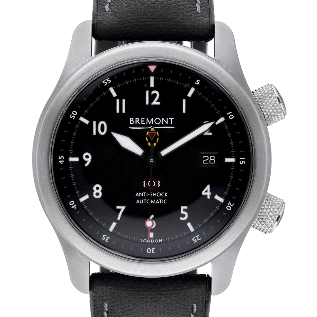 A Bremont MBII Watch, Black Leather & Rubber Strap with a Stainless Steel Case & Clasp on a Black Dial