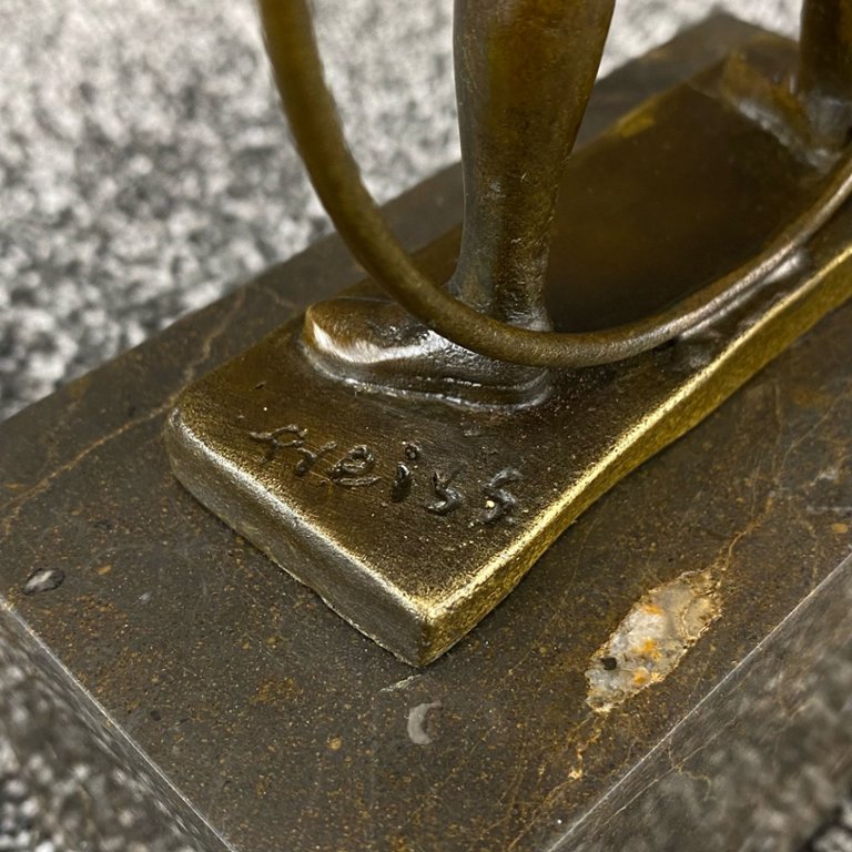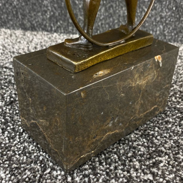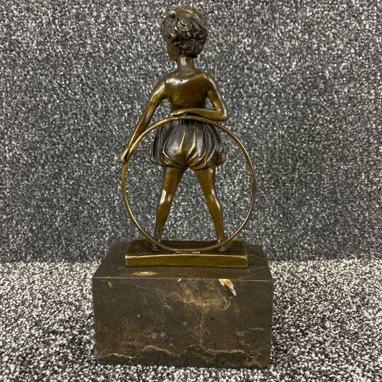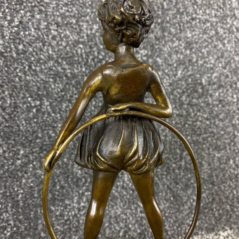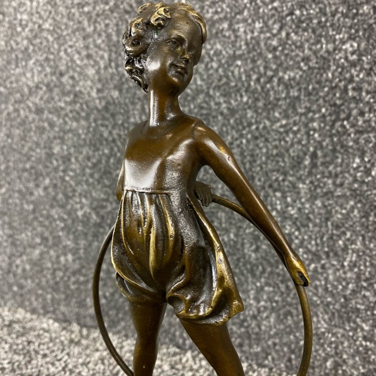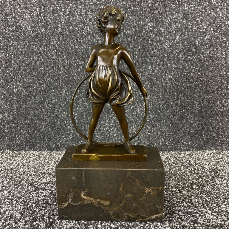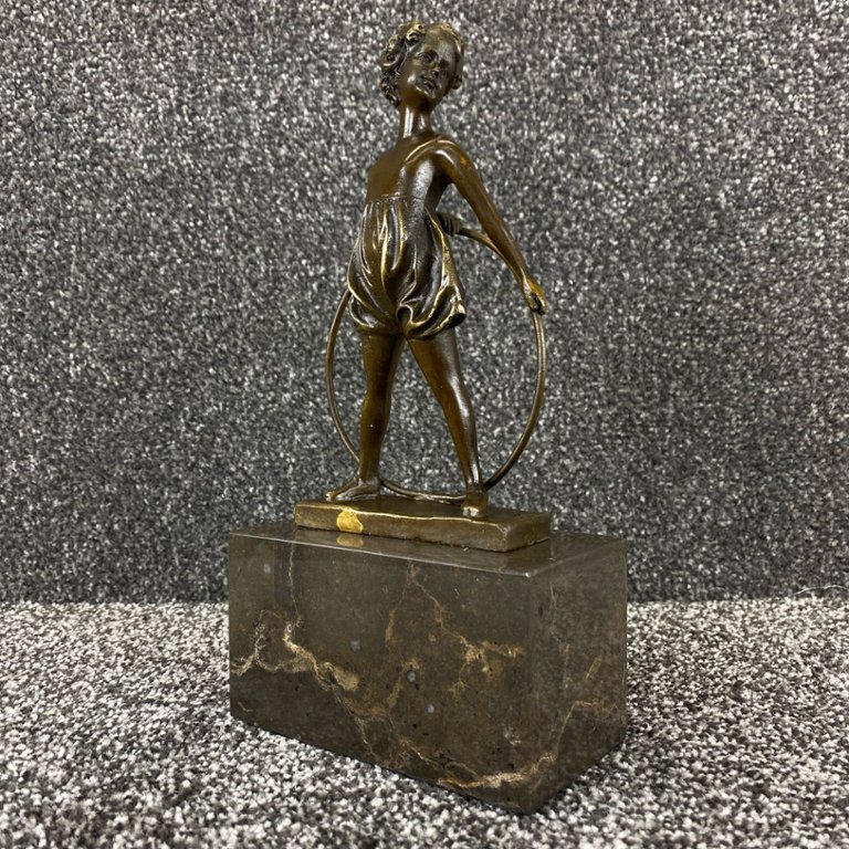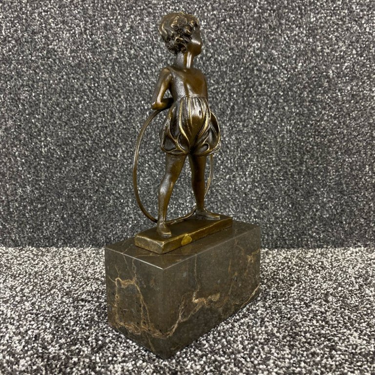 A bronze sculpture of a Child with Hoop on a grey marble base.