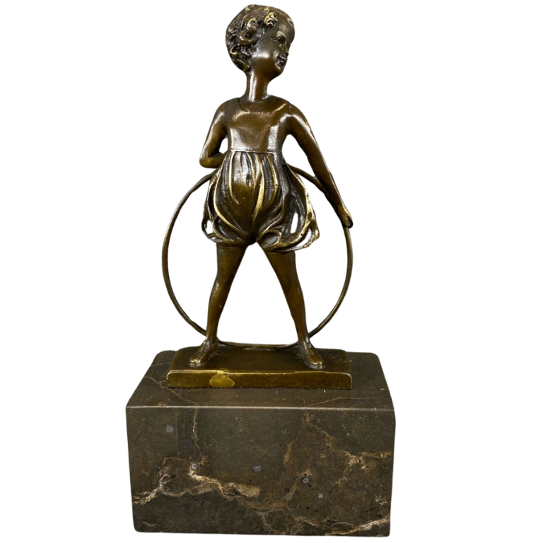 A bronze sculpture, capturing the innocence and joy of childhood, features a young child confidently standing with a hoop in hand. The figure is carefully crafted with flowing, detailed curls, and the child’s posture conveys a sense of playful pride and movement. Dressed in charming vintage-style attire, the child’s slightly tilted head and poised stance suggest they are on the verge of a joyous game.