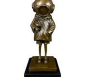 The use of bronze not only provides a timeless, warm patina but also adds a classic touch to the piece, highlighting the delicate artistry in the folds of the clothing and the subtle expression on the child’s face. The figure is mounted on a smooth, grey marble base, grounding the lively form with a solid and elegant foundation. This sculpture effortlessly combines charm and sophistication, making it a perfect decorative item for art lovers or those with an appreciation for the simple joys of youth captured in fine art.