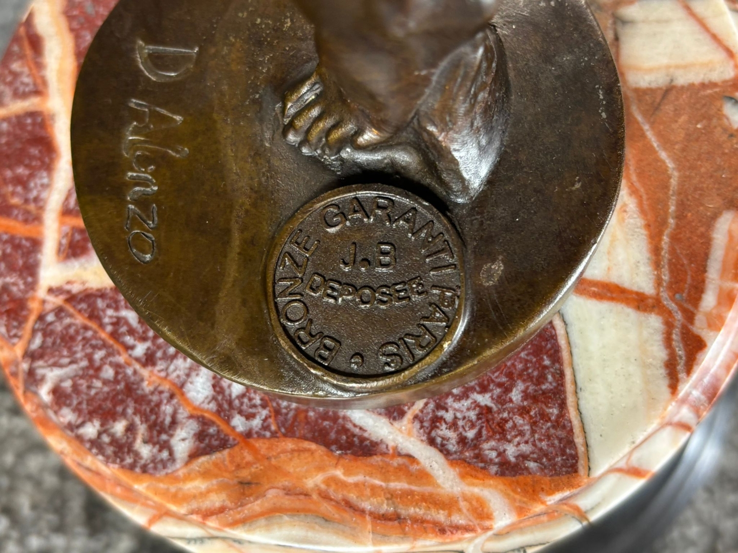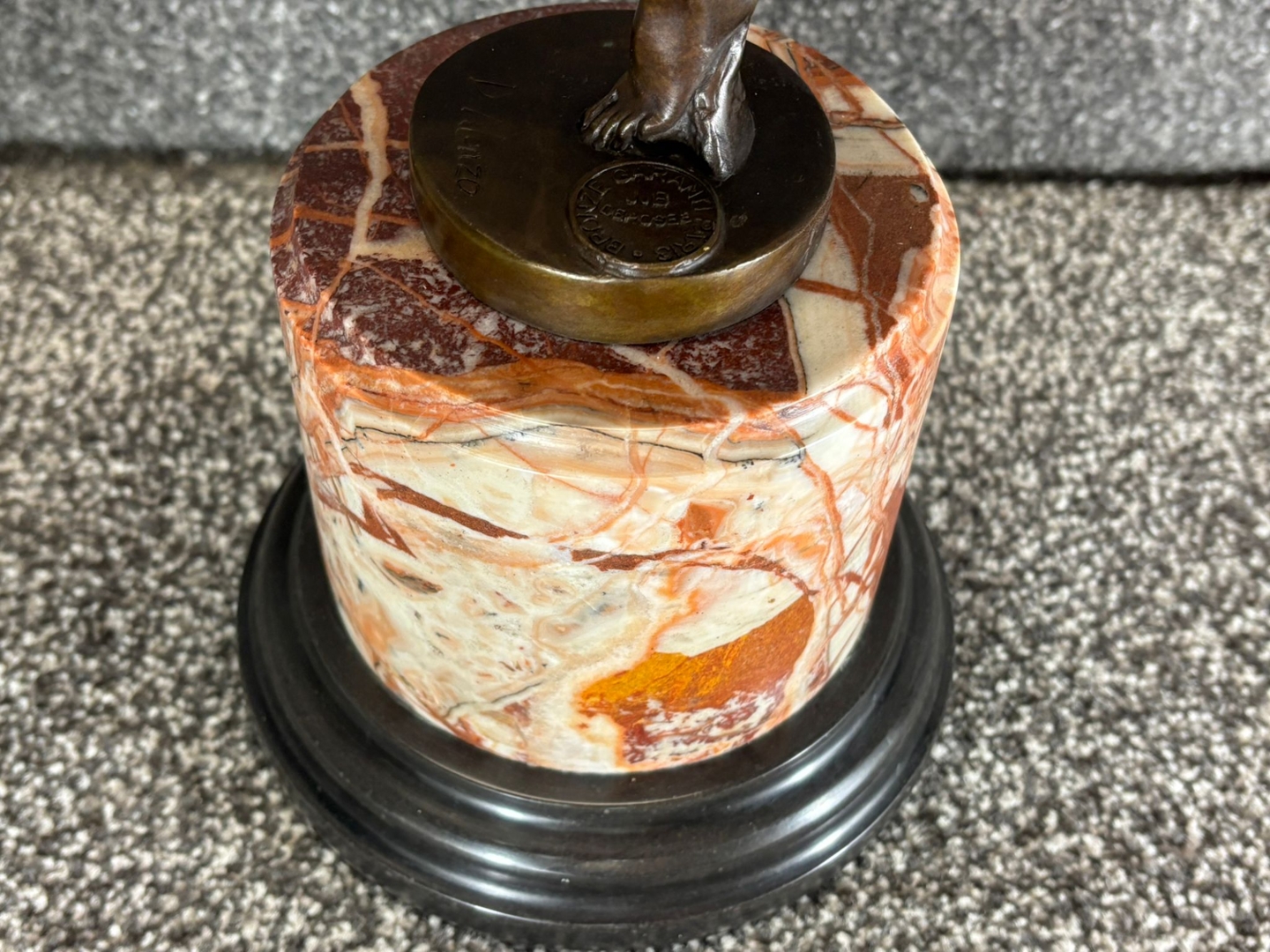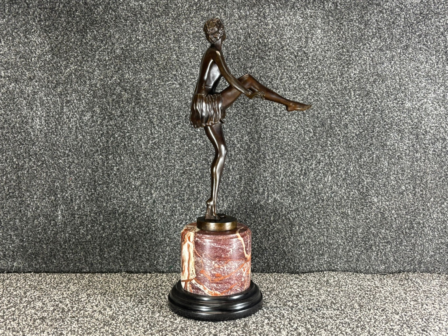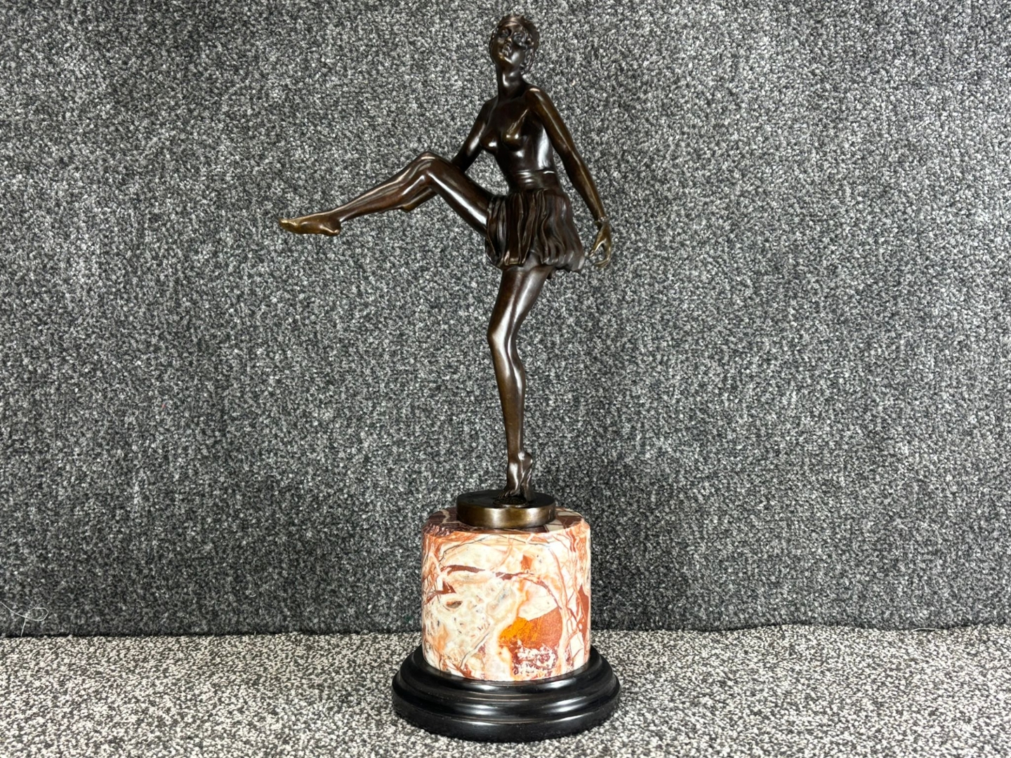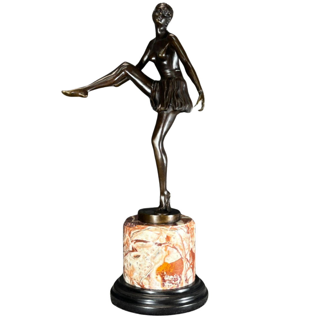 The figure stands atop a beautifully veined cylindrical marble base in soft tones of peach, cream, and rust, grounded by a sleek black plinth that enhances the sculpture’s presence and poise. With her skirt subtly flared and her limbs elongated in motion, the dancer radiates charm and energy.